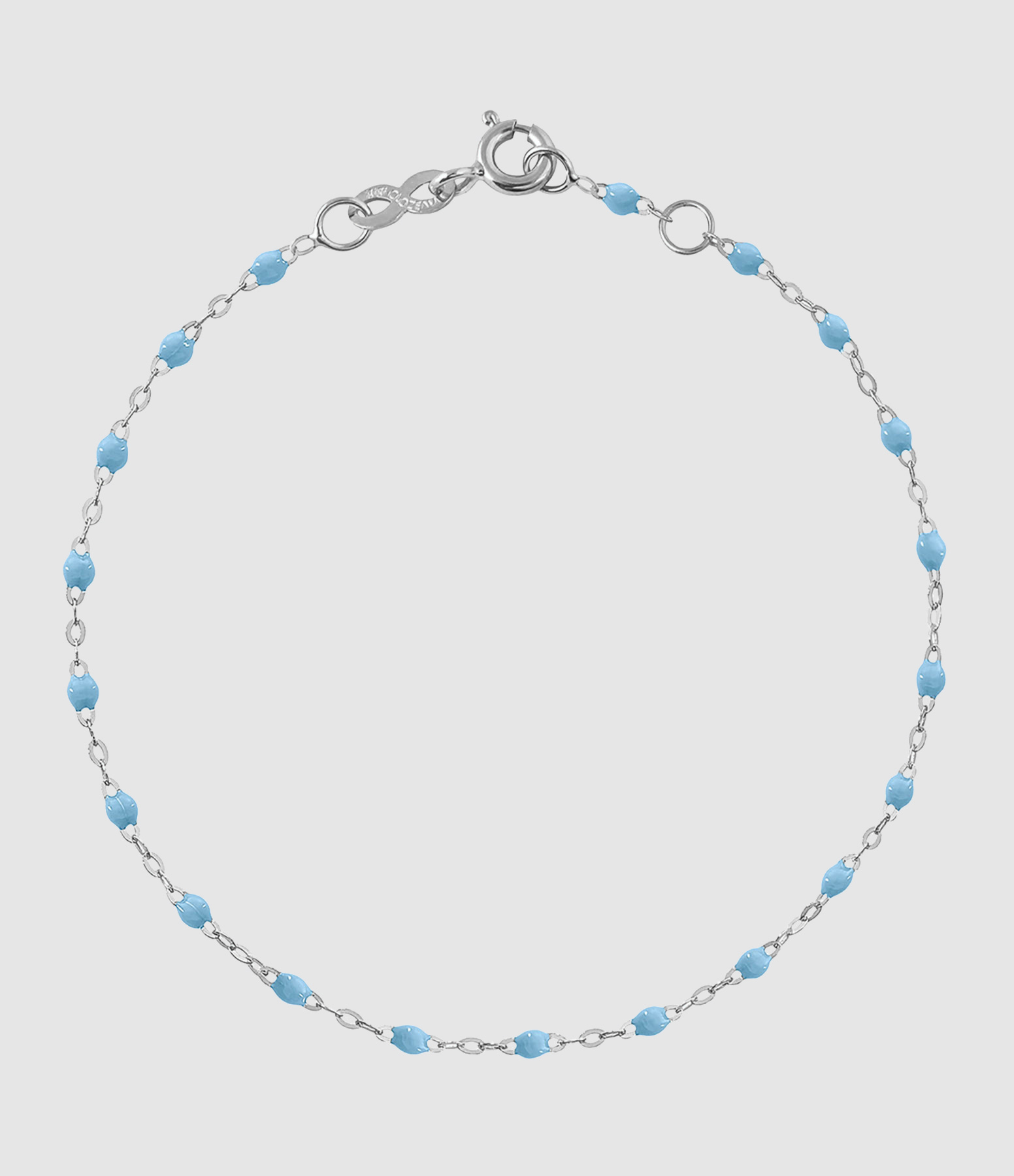Chaine de cheville en or blanc agrémenté de perles de résine. Fermoir classique à ressort avec contre-anneau.