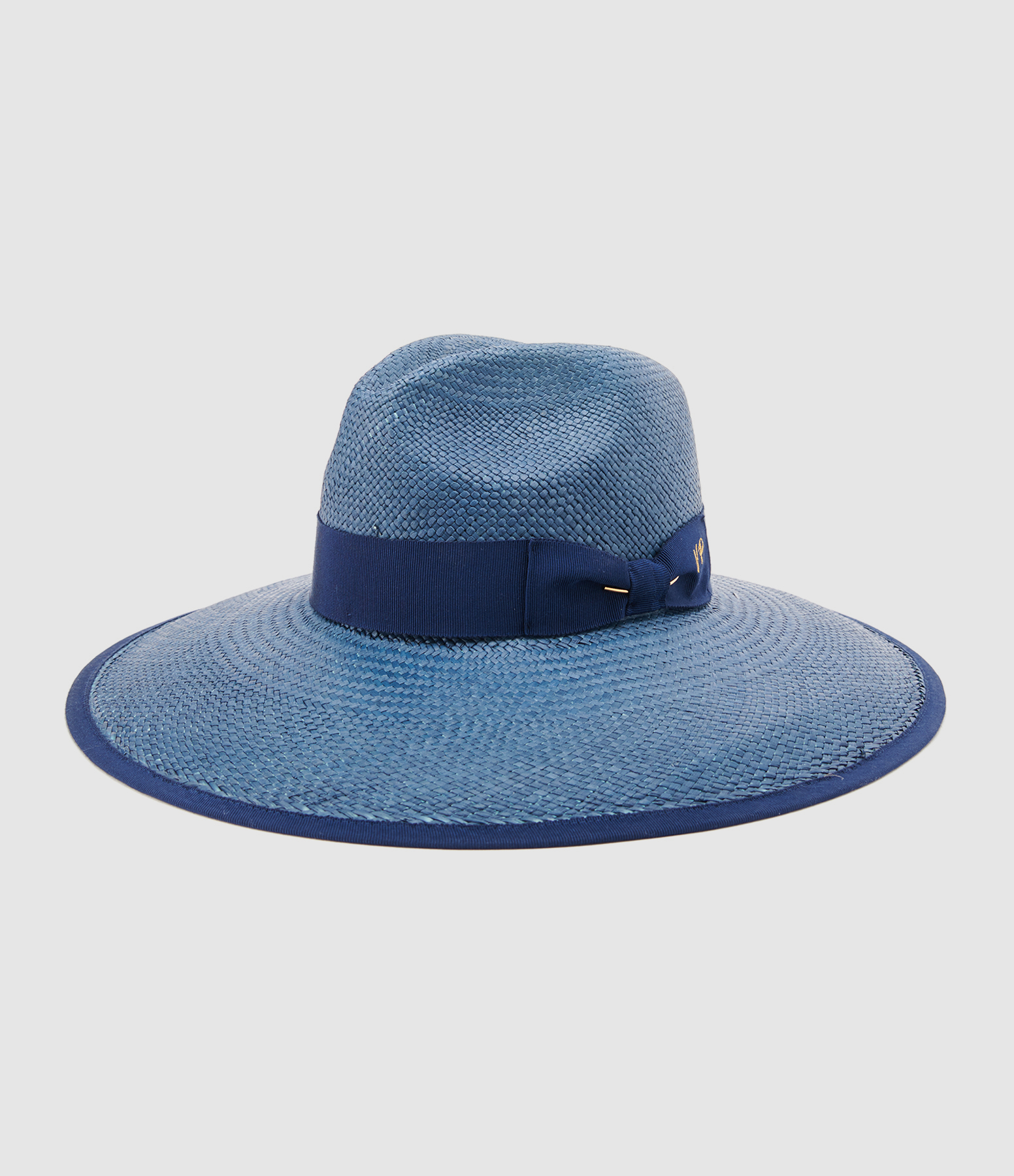 Chapeau en paille bleue. Nœud décoratif avec petite broderie "VP" dorée. Intérieur doublé avec bandes de propreté.