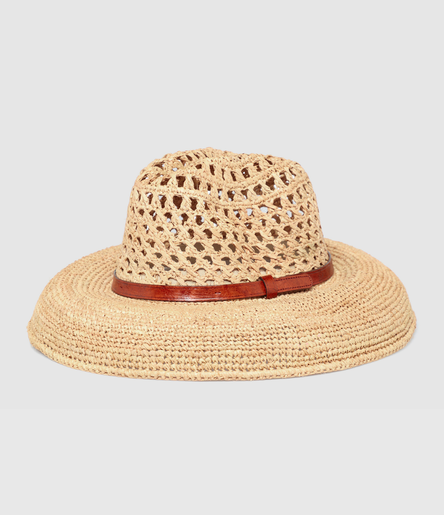 Chapeau en raphia naturel, orné d'un lien en cuir. Intérieur doublé avec bande de propreté en coton.