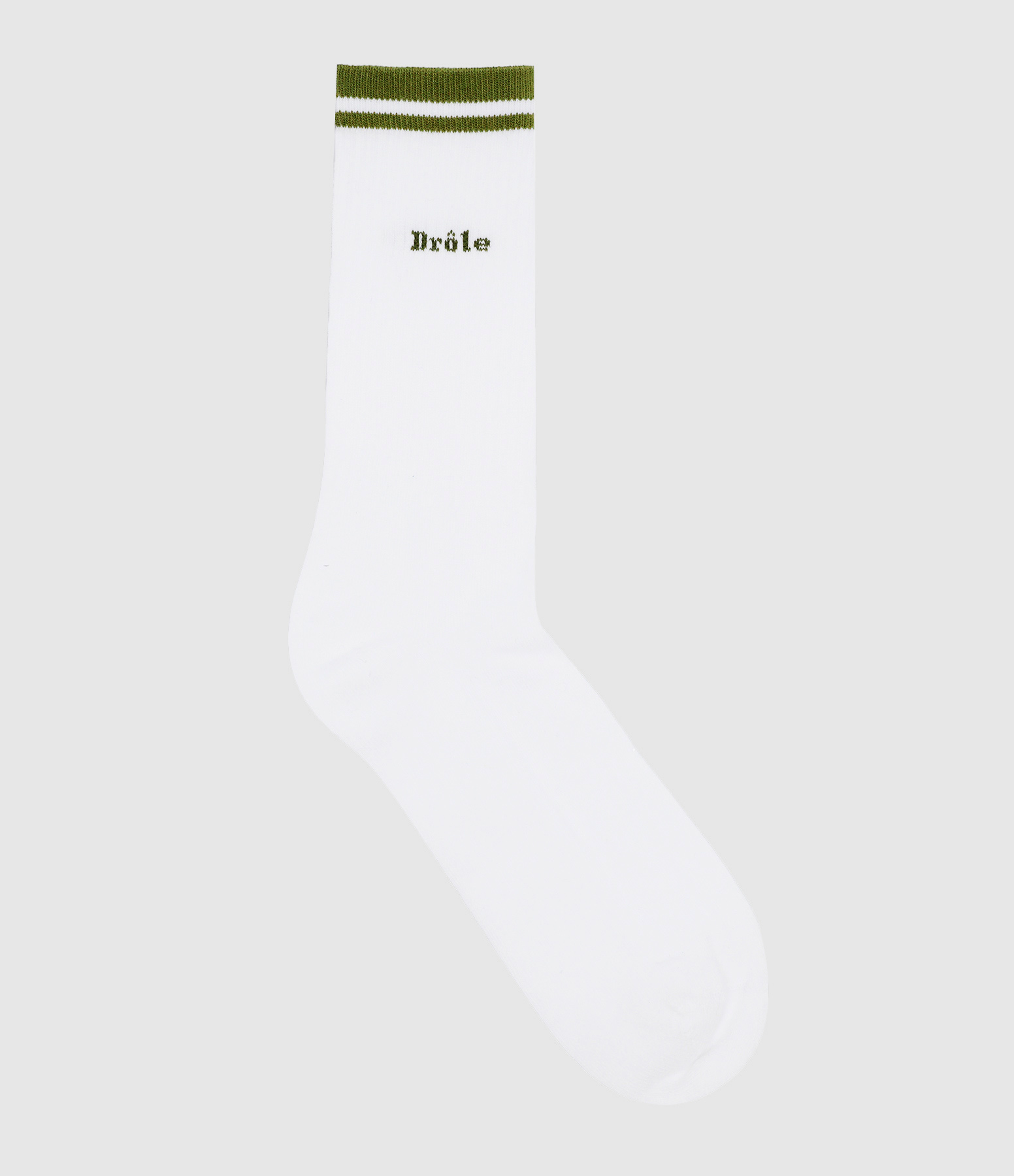 Chaussettes en coton côtelé blanc. Liseré vert et inscription "DROLE" verte sur la cheville.