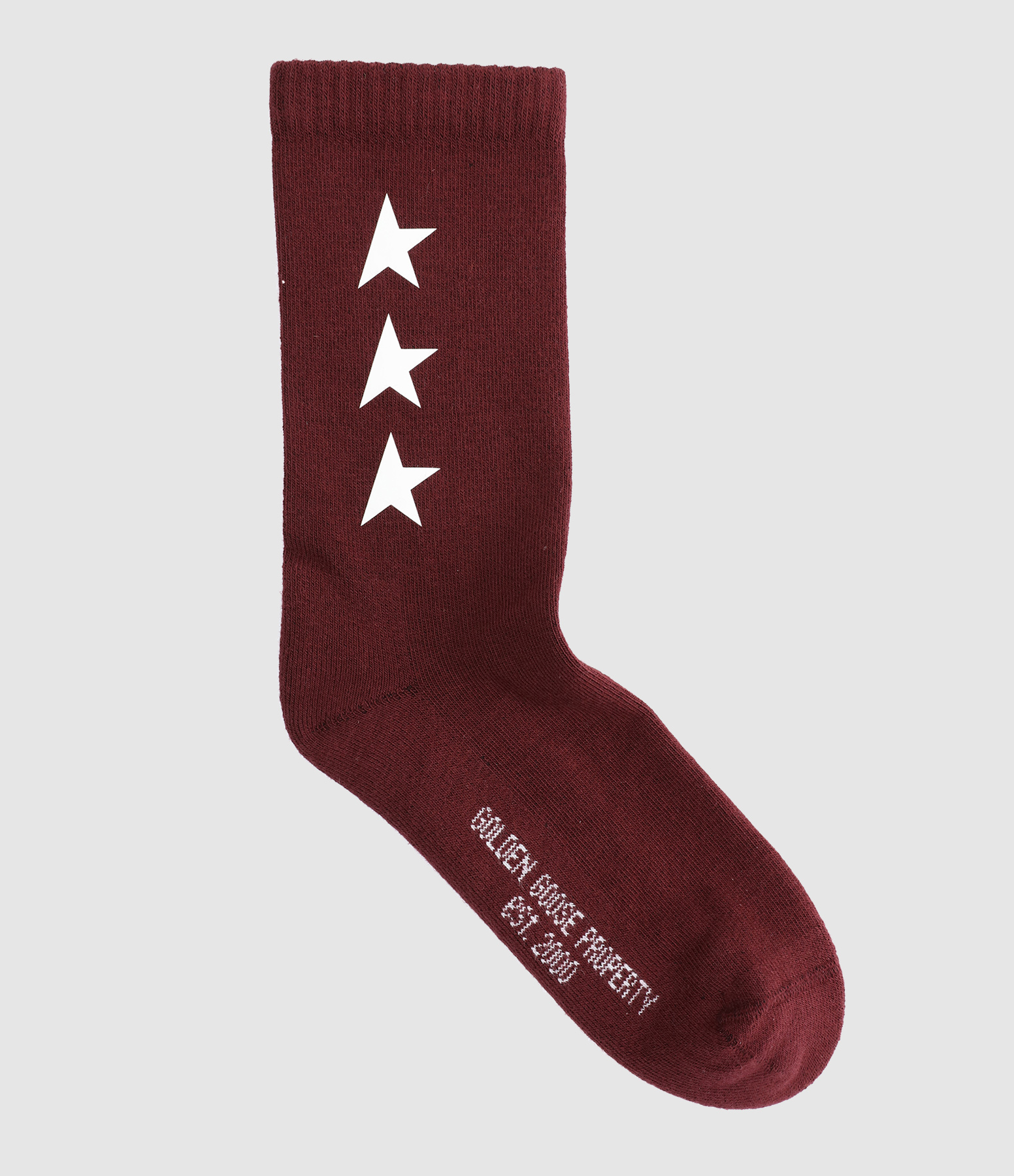 Chaussettes hautes en coton bordeaux. Étoiles blanches sur les côtés. Inscription "GOLDEN GOOSE PROPERTY" blanche sur les côtés.