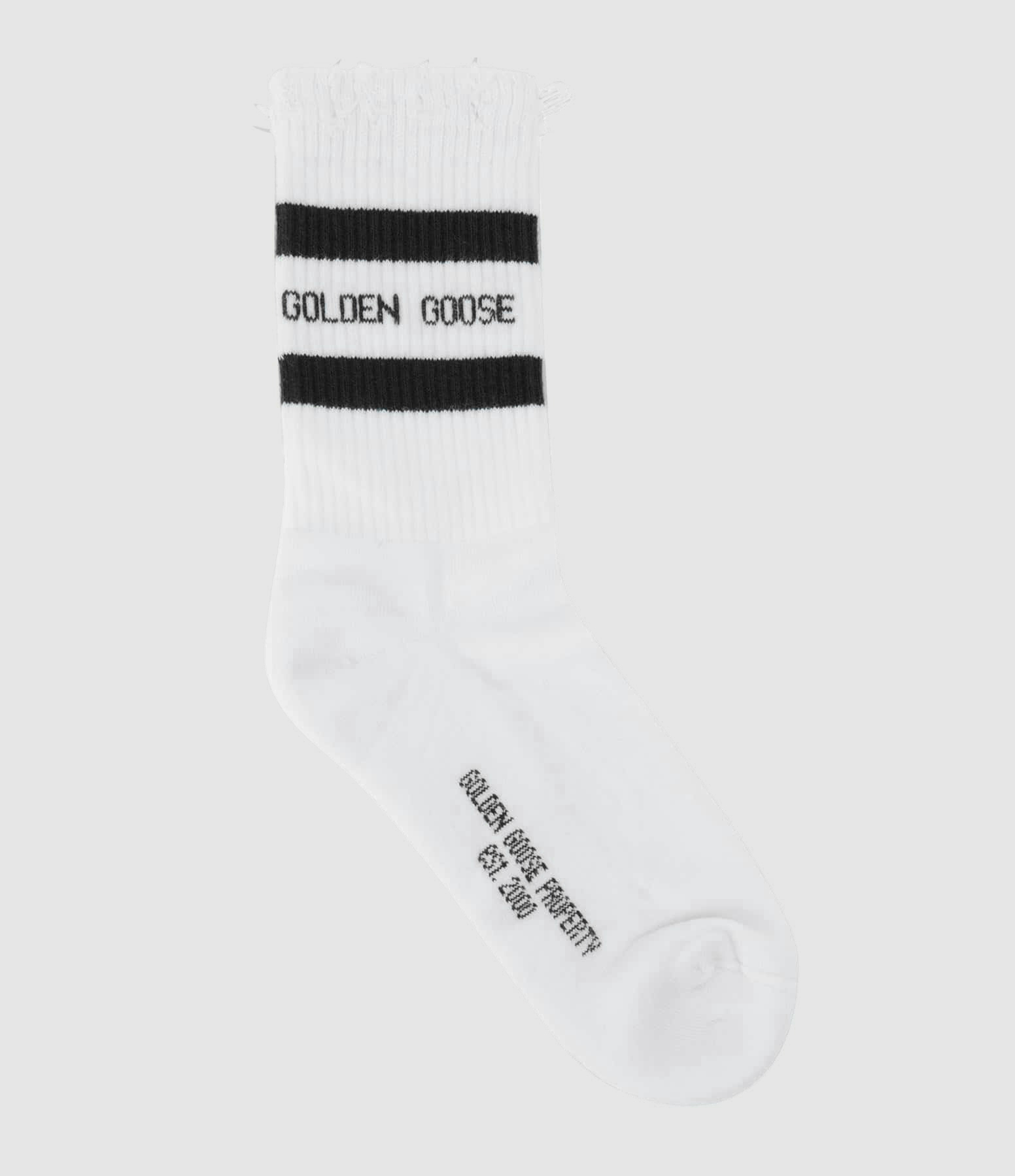 Chaussettes hautes en maille de coton blanc. Inscription "GOLDEN GOOSE" et double rayure noirs imprimés. Bords frangés.