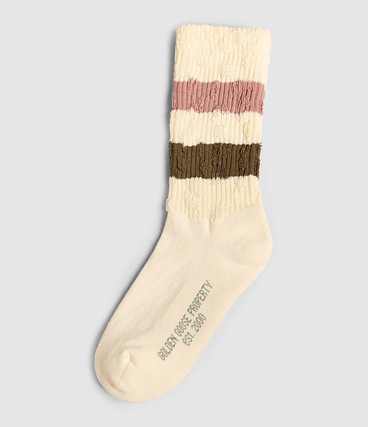 Chaussettes hautes en coton blanc rayées roses et kaki au niveau de la cheville. Cheville côtelée et effet usé. Inscription "GOLDEN GOOSE PROPERTY" gris sous la chaussette.