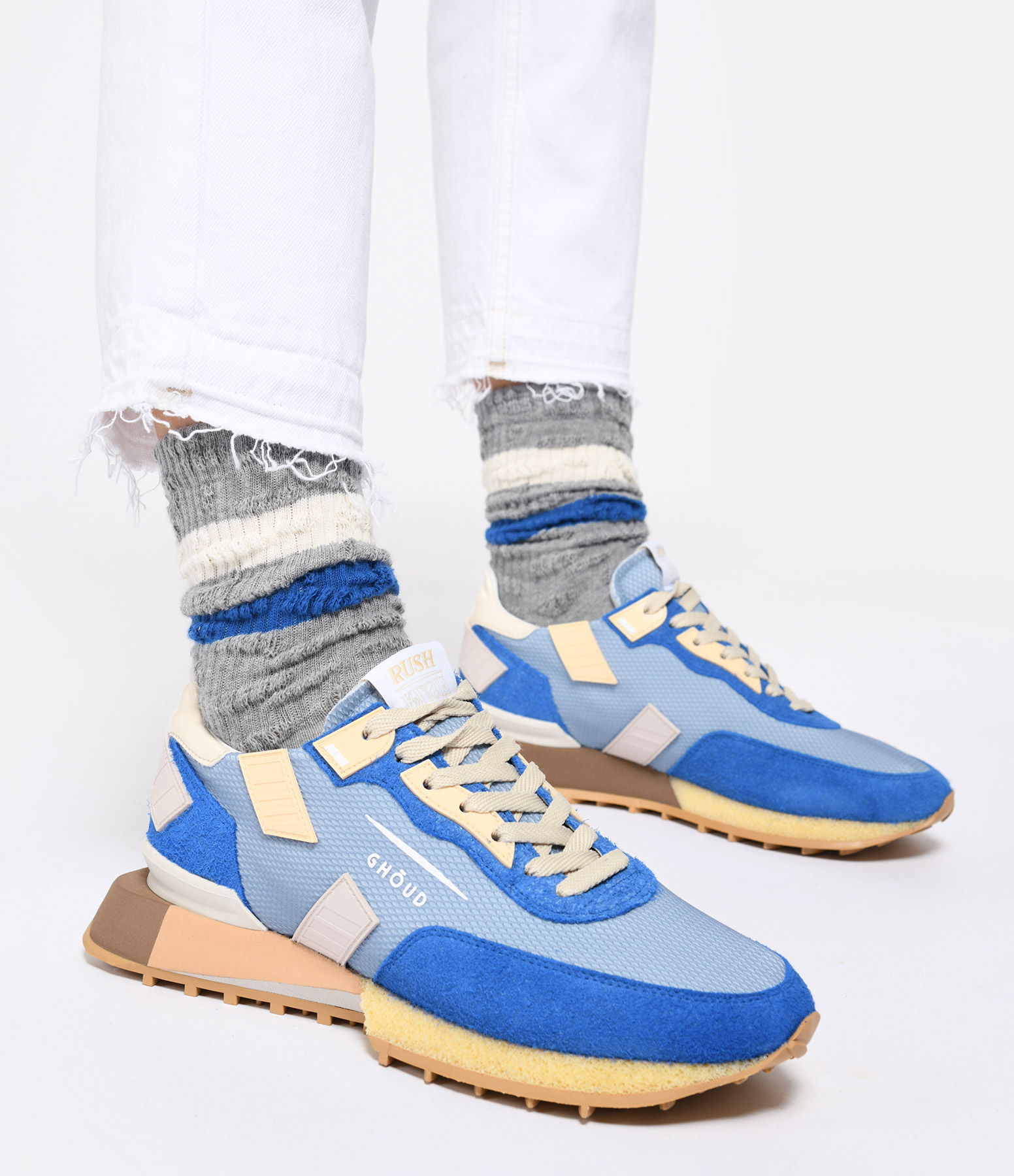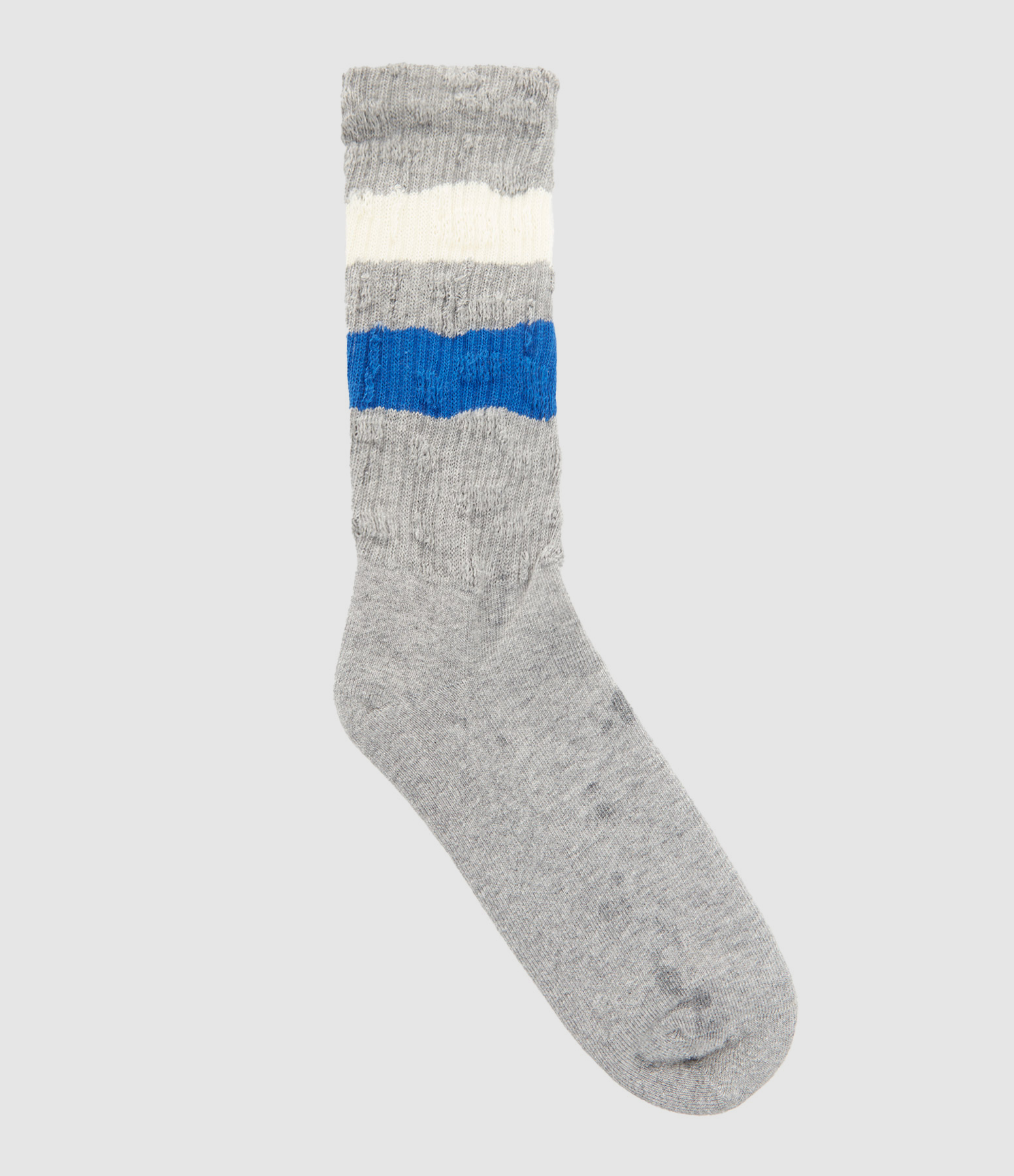 Chaussettes hautes en maille de coton gris. Rayures bleues et blanches. Bord côte à l'effet usé.
