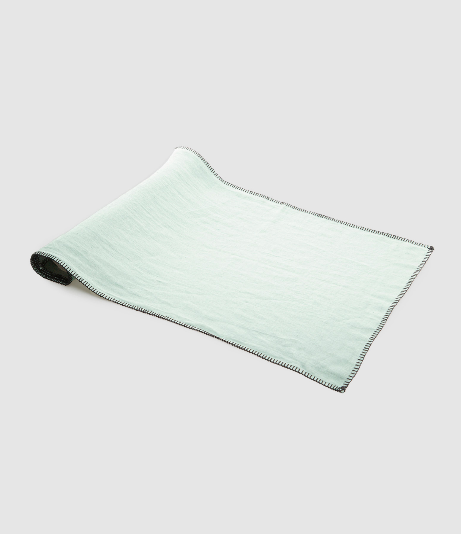 Chemin de table en lin lavé vert clair, avec finition en surjet noir.