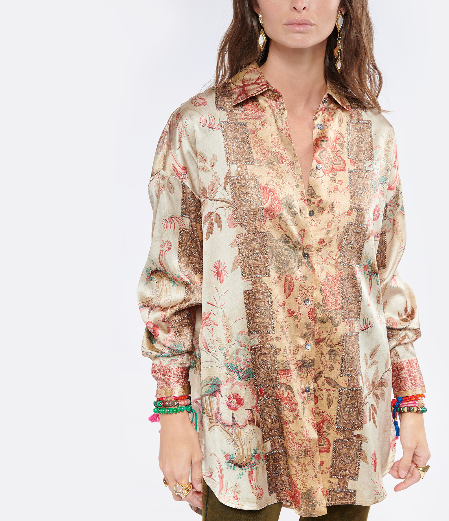 Chemise en soie à imprimé multicolore. Col chemise. Manches longues. Fermeture par boutons. Deux poches plaquées. Plus longue à l'arrière. Coupe droite. Base droite.