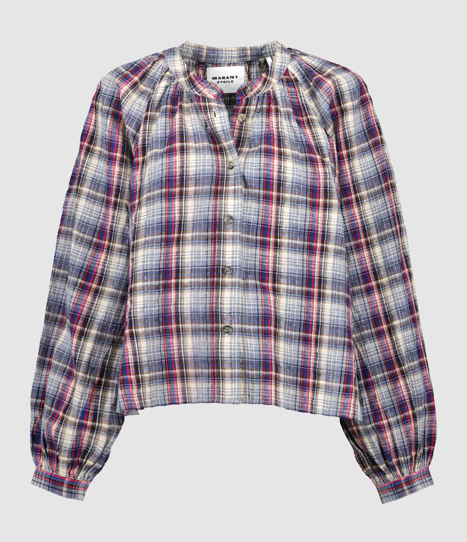 Chemisier à carreaux bleu. Col mao. Fermeture par boutons sur le devant. Fronces sur le devant et le dos. Manches longues ballon. Fentes latérales. Coupe droite et large. Base arrondie.