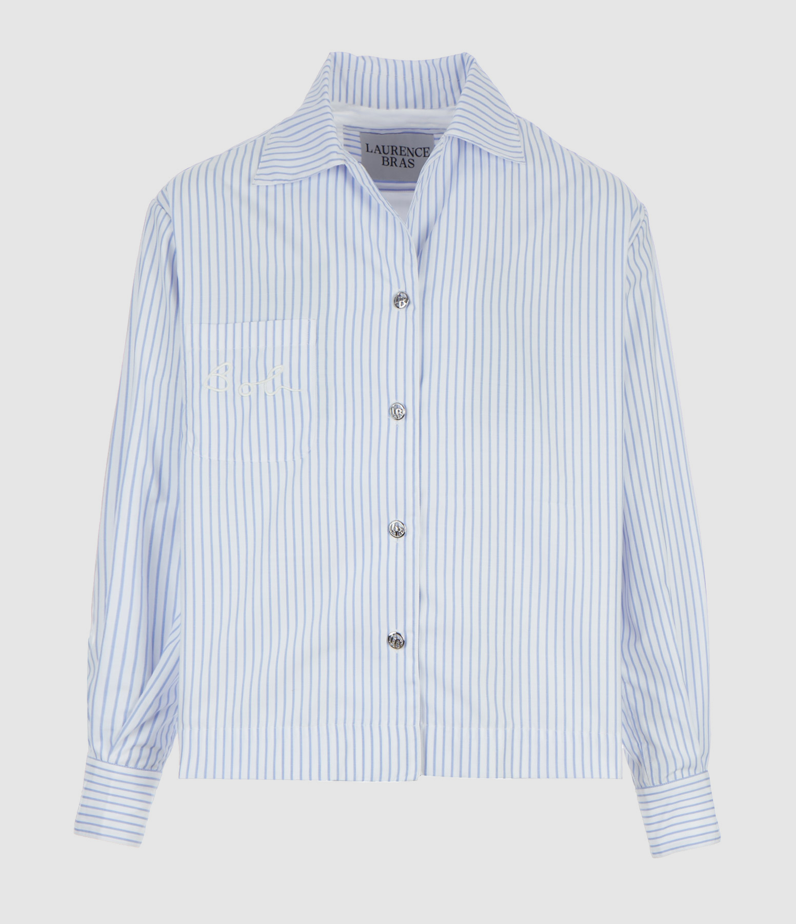 Chemise à rayures bleues et blanches. Col chemise. Manches longues. Une poche plaquée poitrine avec broderie blanche "Bob". Broderie bleue bowling dans le dos. Fermeture avec boutons argentés "LB". Coupe droite. Base droite.