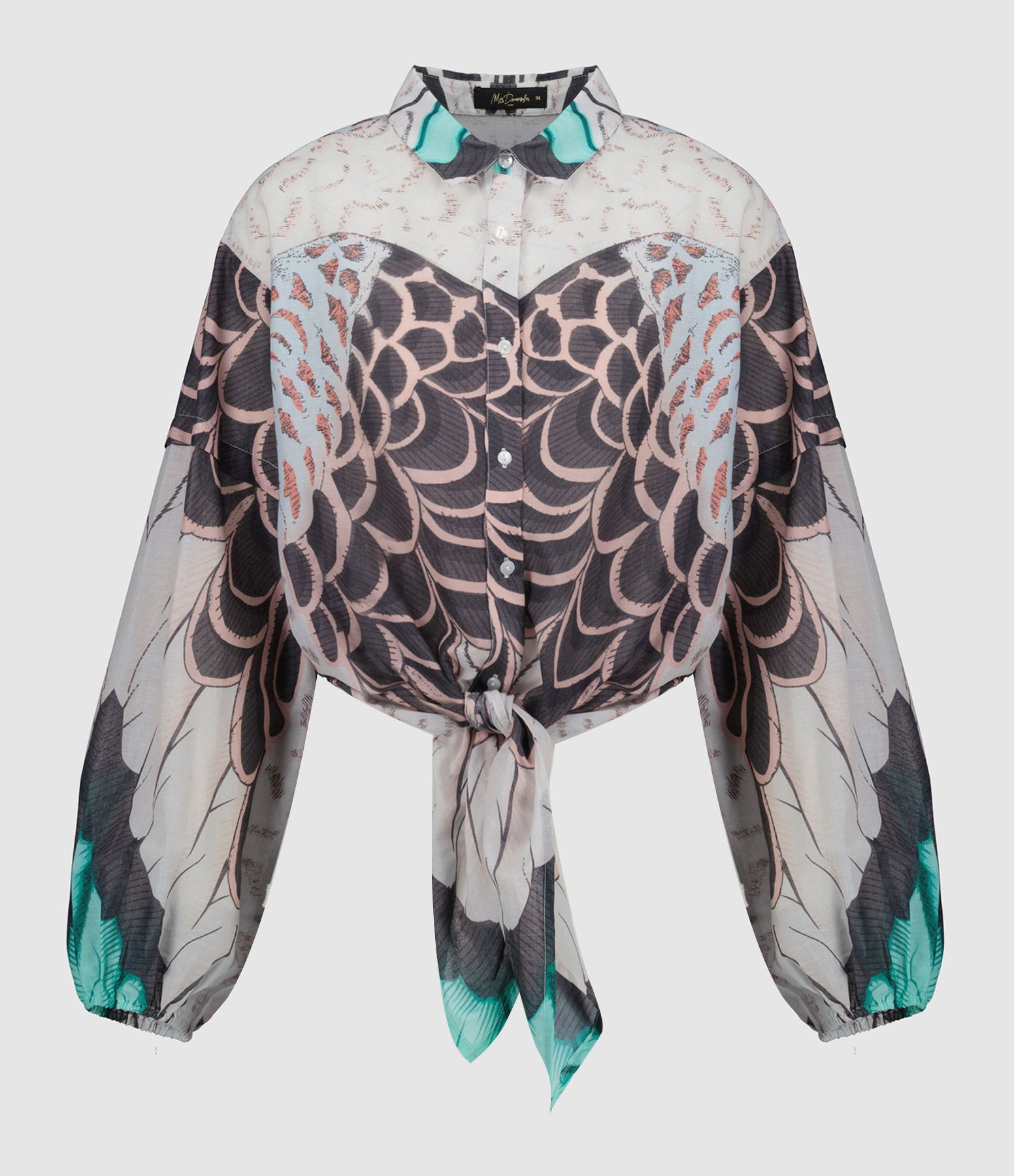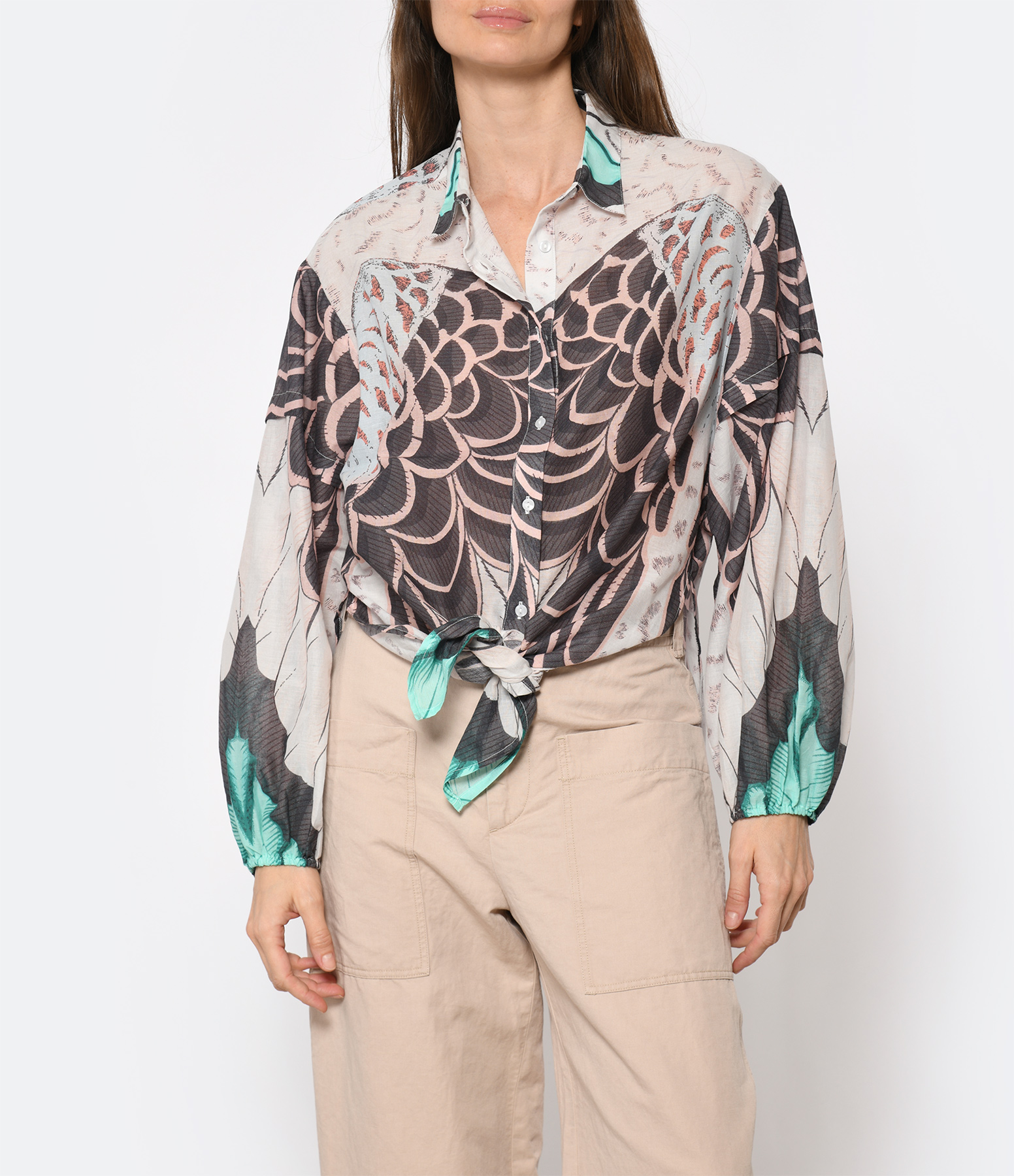 Chemise en coton à imprimé multicolore. Col chemise. Liens à nouer à l'avant. Fermeture par boutons. Manches longues bouffantes et élastiquées aux poignets. Coupe large. Base arrondie plus longue à l'arrière.