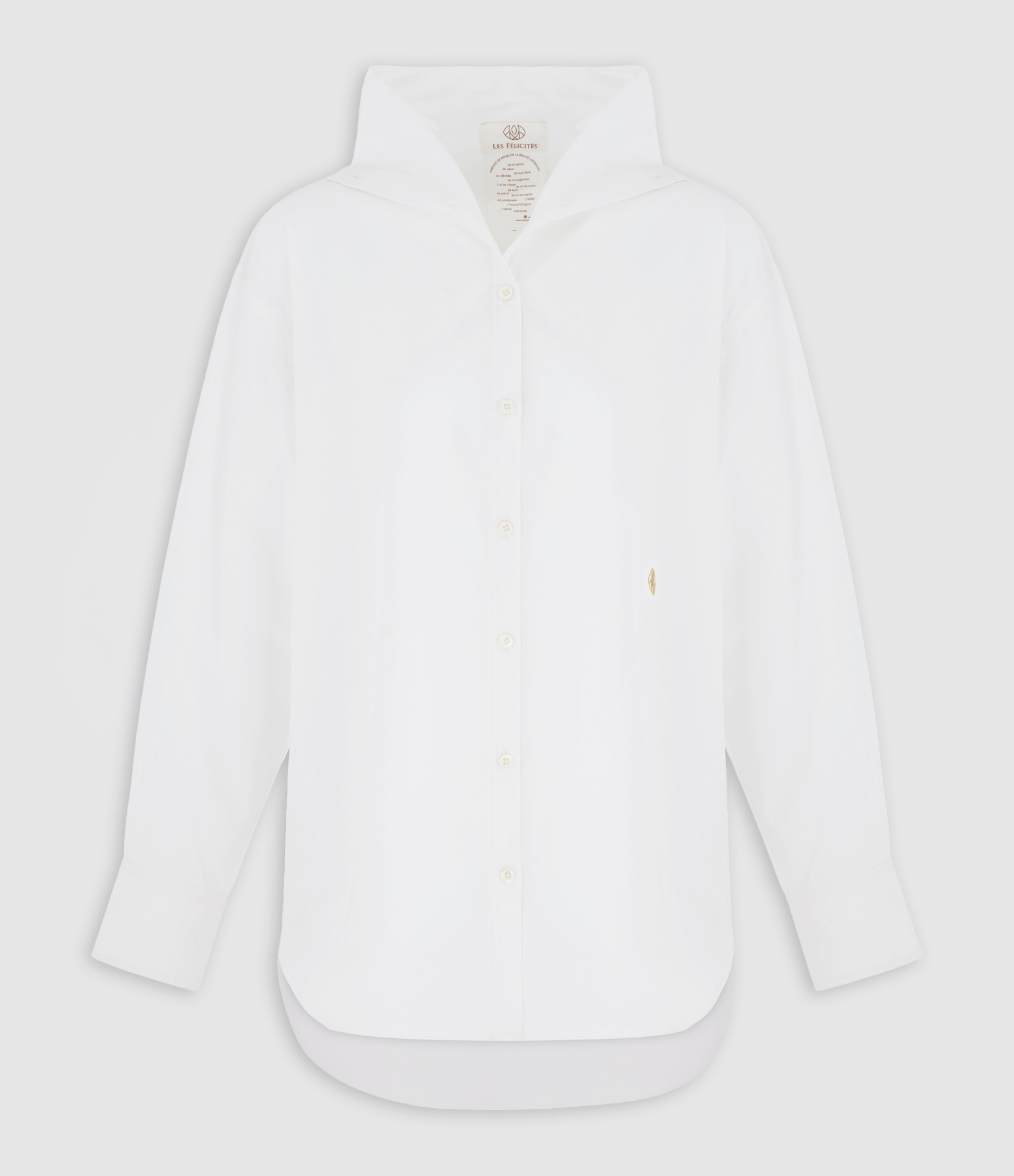 Chemise blanche, col montant. Logo doré brodé sur l'avant. Manches longues avec poignets boutonnés. Coupe oversize et longue. Base arrondie, plus longue à l'arrière.