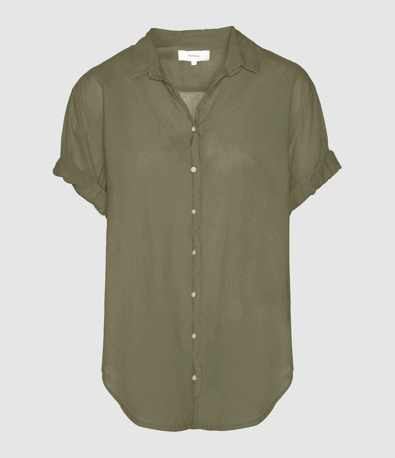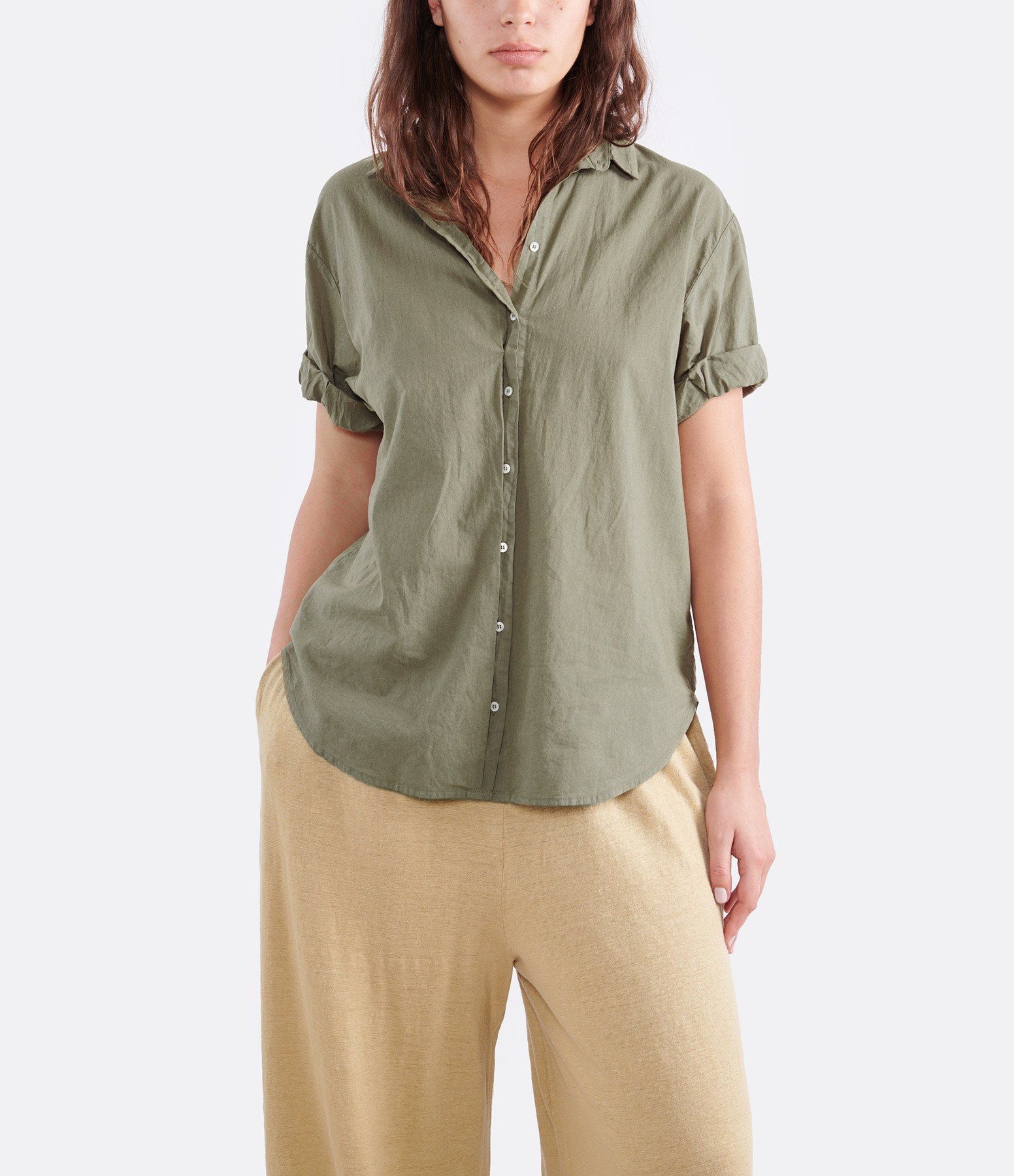 Chemise en coton kaki. Col chemisier. Manches courtes retroussées. Fermeture boutonnée sur le devant. Boutons blancs. Coupe droite ample. Base arrondie plus longue à l'arrière.