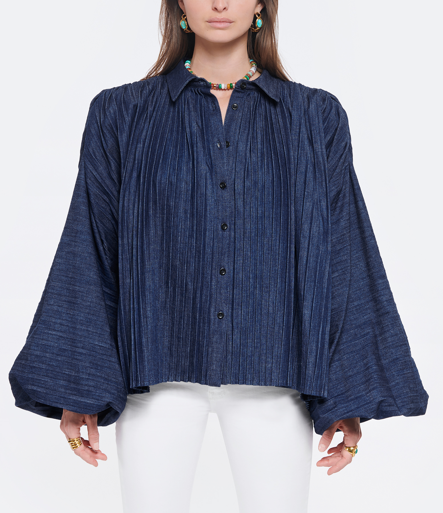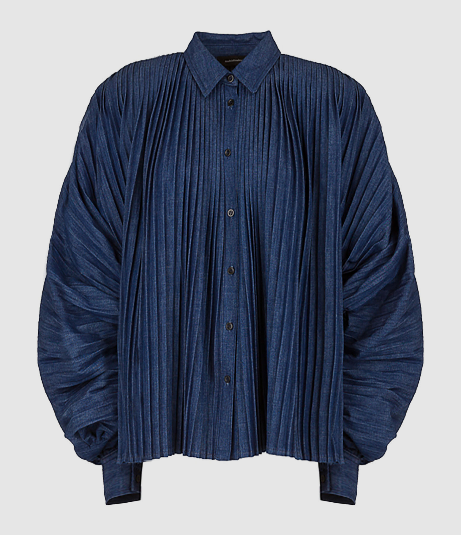 Chemise en coton denim plissé bleu. Col chemisier. Manches longues plissées ballon chauve-souris oversize. Fermeture par boutons. Coupe droite. Base arrondie. Non doublée.