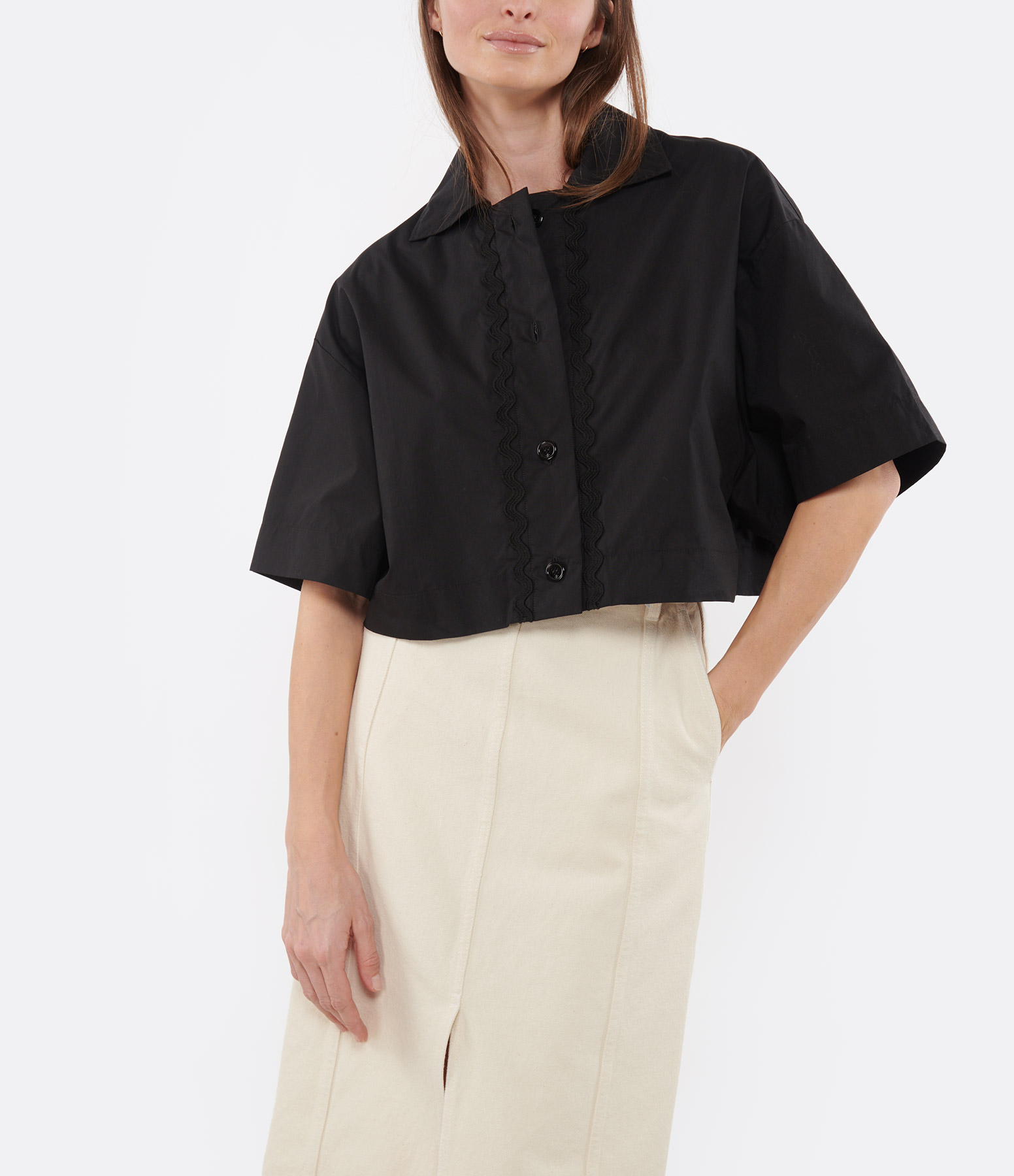 Chemise en popeline de coton noir à manches courtes avec broderies tressées. Col chemise. Patte de boutonnage à l'avant. Manches chauve-souris. Coupe crop droite. Base droite.