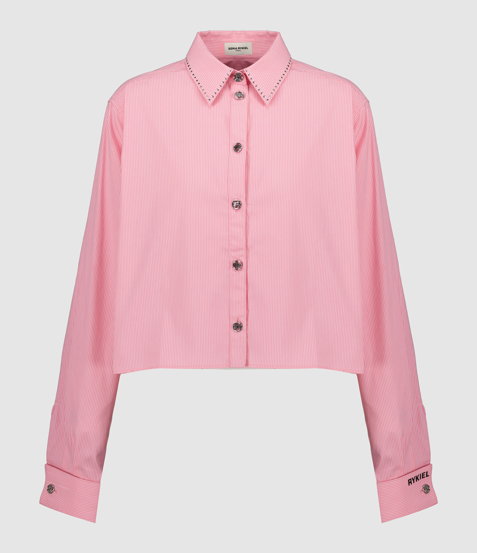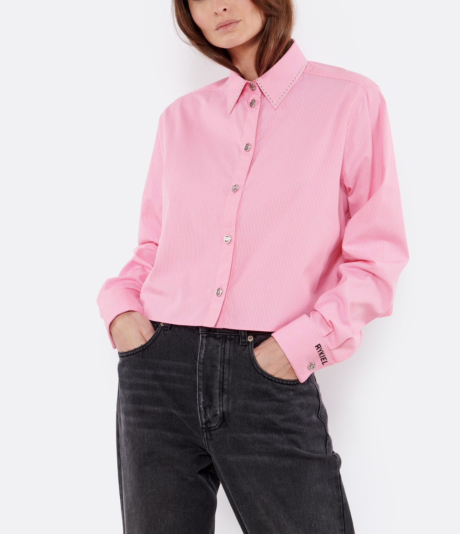 Chemise crop rose à rayures blanches. Col chemise avec rivets métalliques. Patte de boutonnage à l'avant. Boutons aux initiales de la marque. Poignets boutonnés avec flocage "RYKIEL" en noir. Coupe droite courte. Base droite.