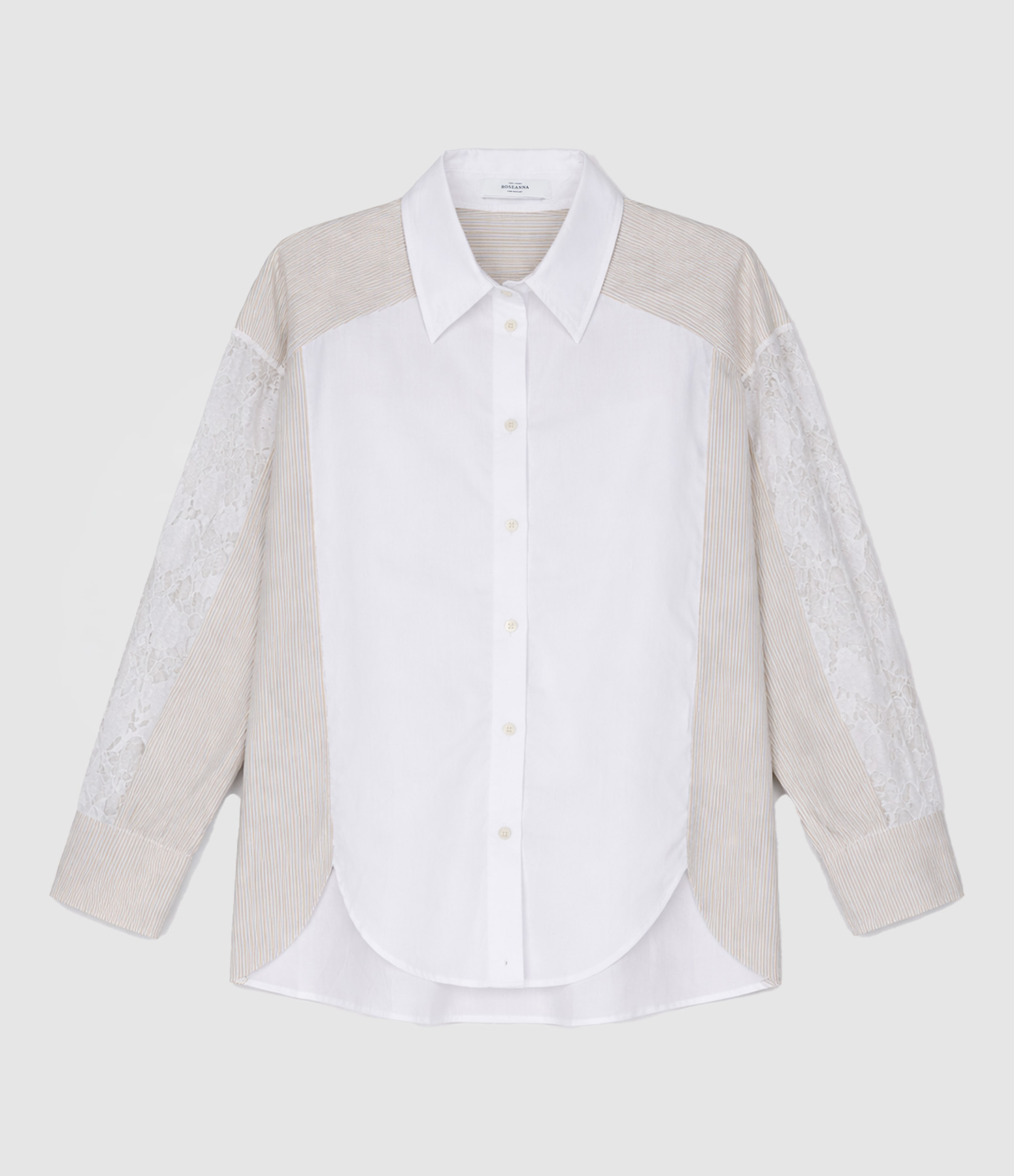 Cette chemise oversize à manches longues présente un col classique, des pattes de boutonnage devant, des découpes aux épaules ainsi qu'un mix matières.