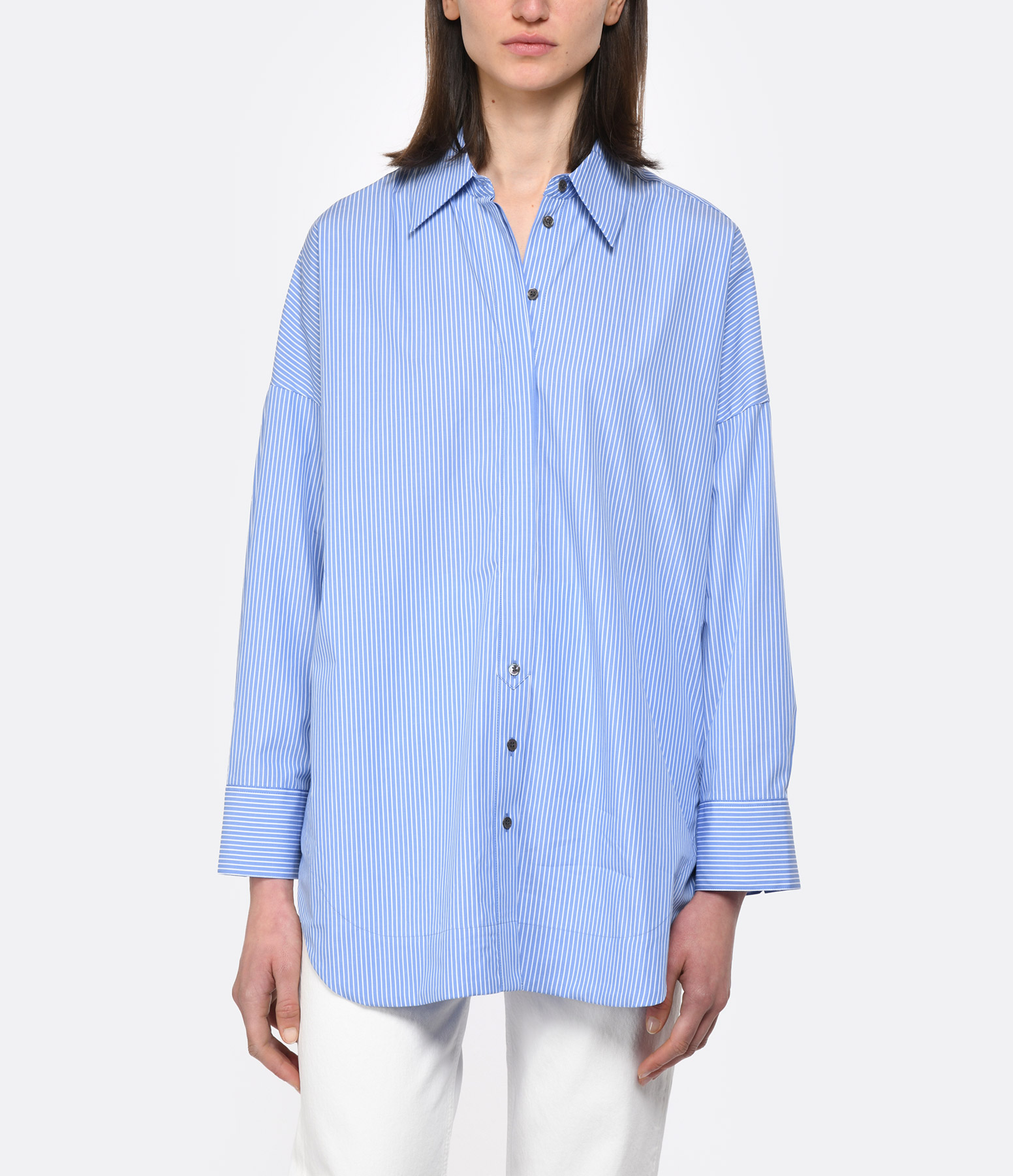 Chemise en coton à rayures bleues. Manches longues resserrées par boutons aux poignets. Col chemisier. Fermeture par boutons sur le devant. Coupe droite. Base arrondie.