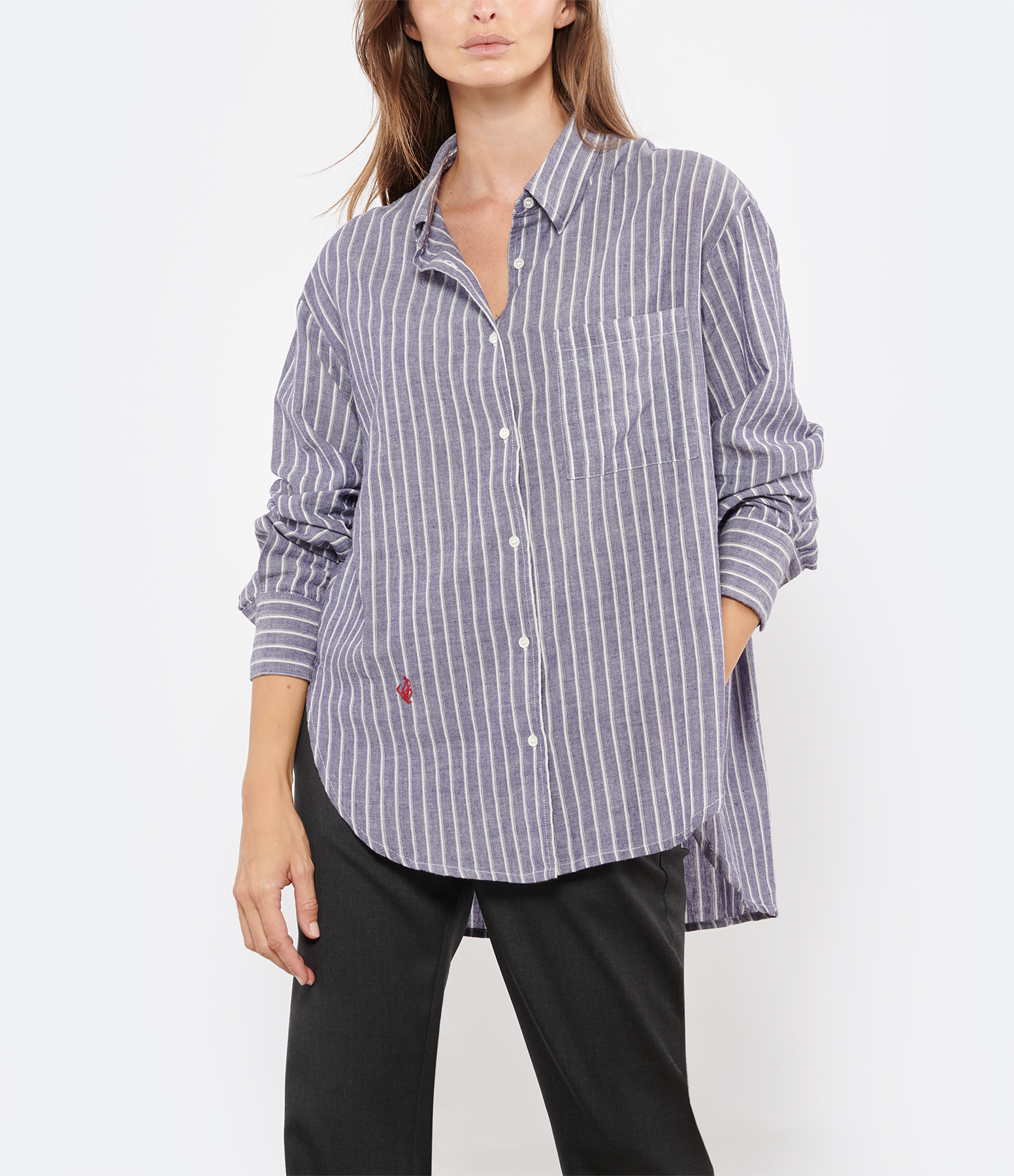 Chemise en coton violet à rayures blanches. Col chemise fermé par boutons nacrés blancs. Une poche plaquée sur la poitrine. Manches longues boutonnées aux poignets. Broderie logo rouge. Coupe droite. Base arrondie.
