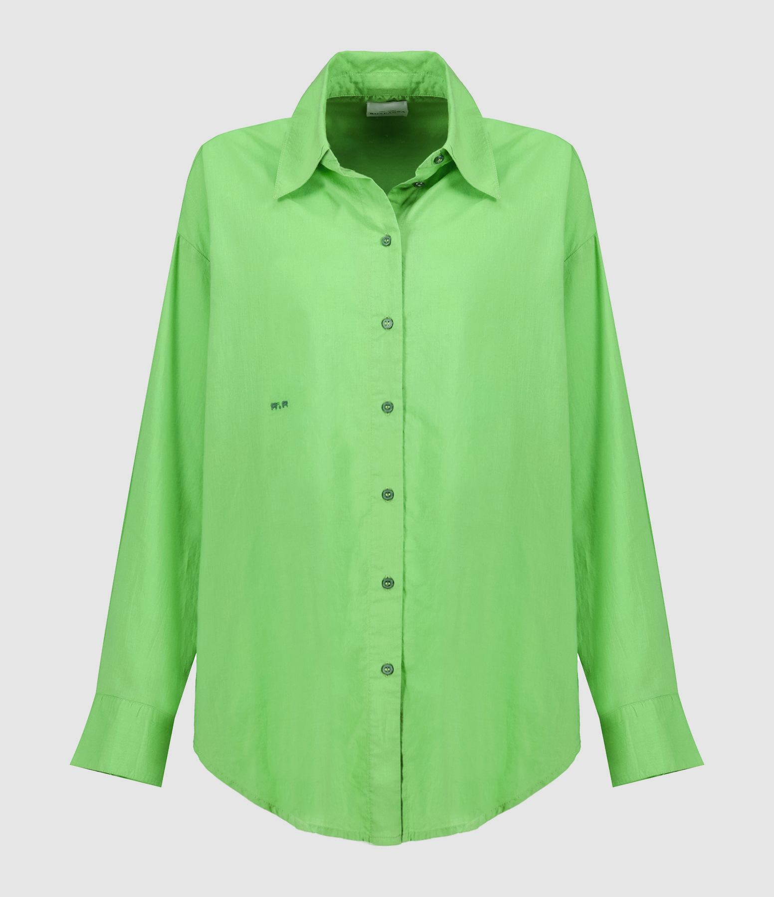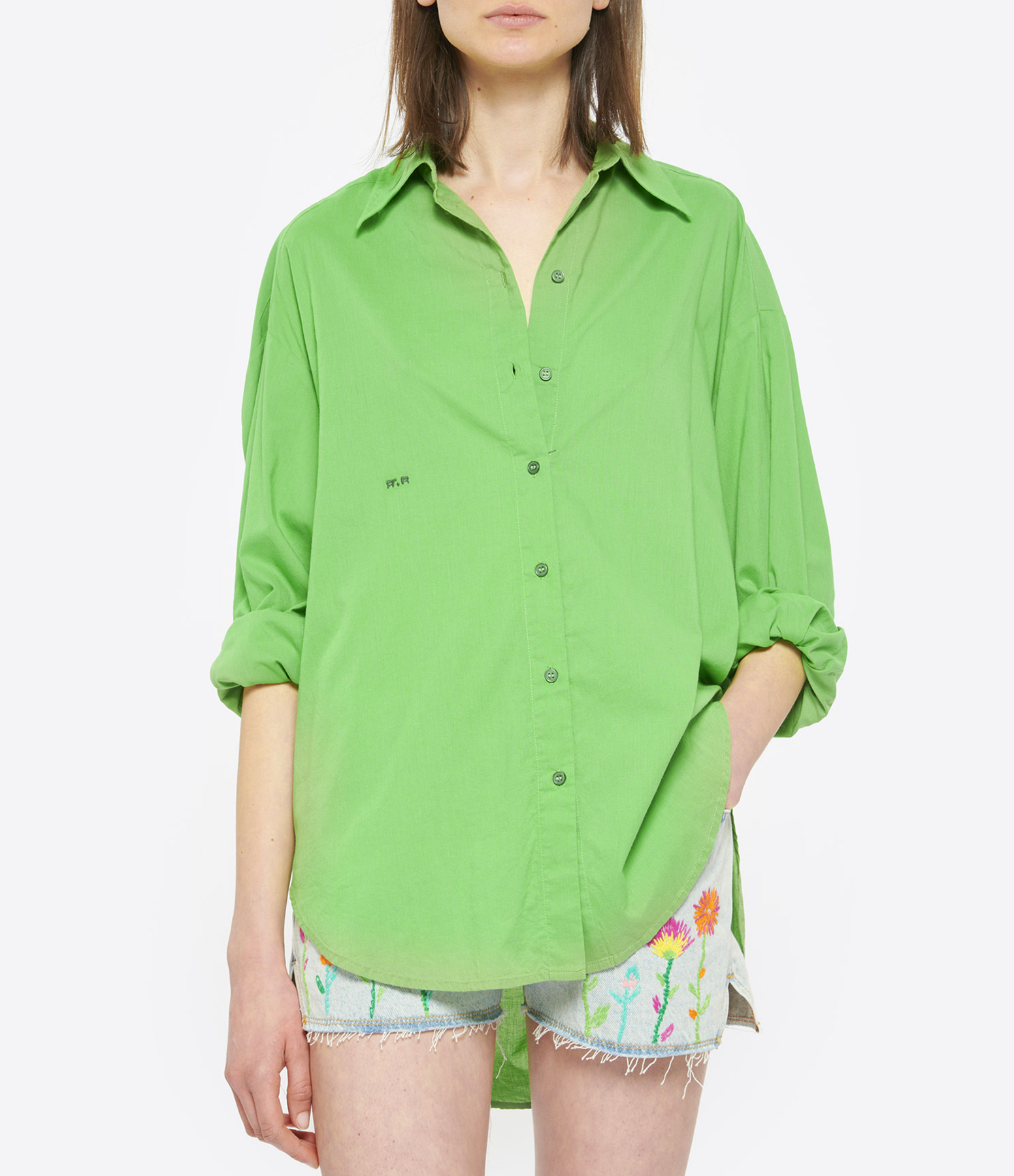 Chemise en coton vert. Manches longues resserrées par boutons aux poignets. Col chemisier. Fermeture par boutons verts sur le devant. Coupe droite. Base droite.