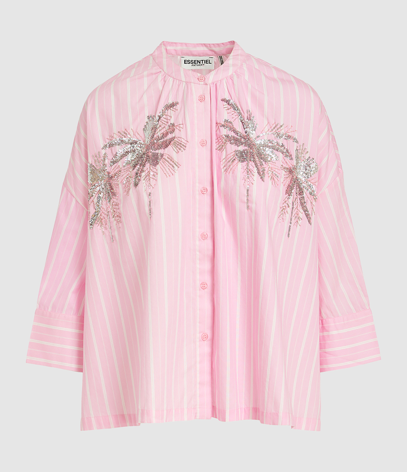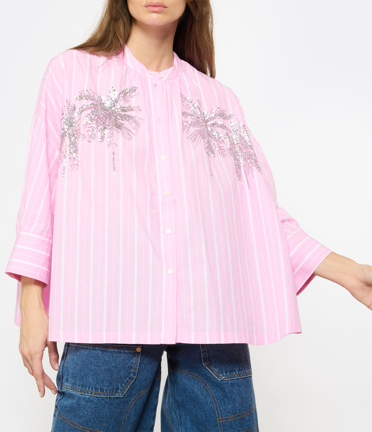 Chemise en coton à rayures roses, broderies palmier perles et paillettes sur la poitrine. Coupe oversize. Col mandarin. Fermeture par boutons. Manches 3/4.
