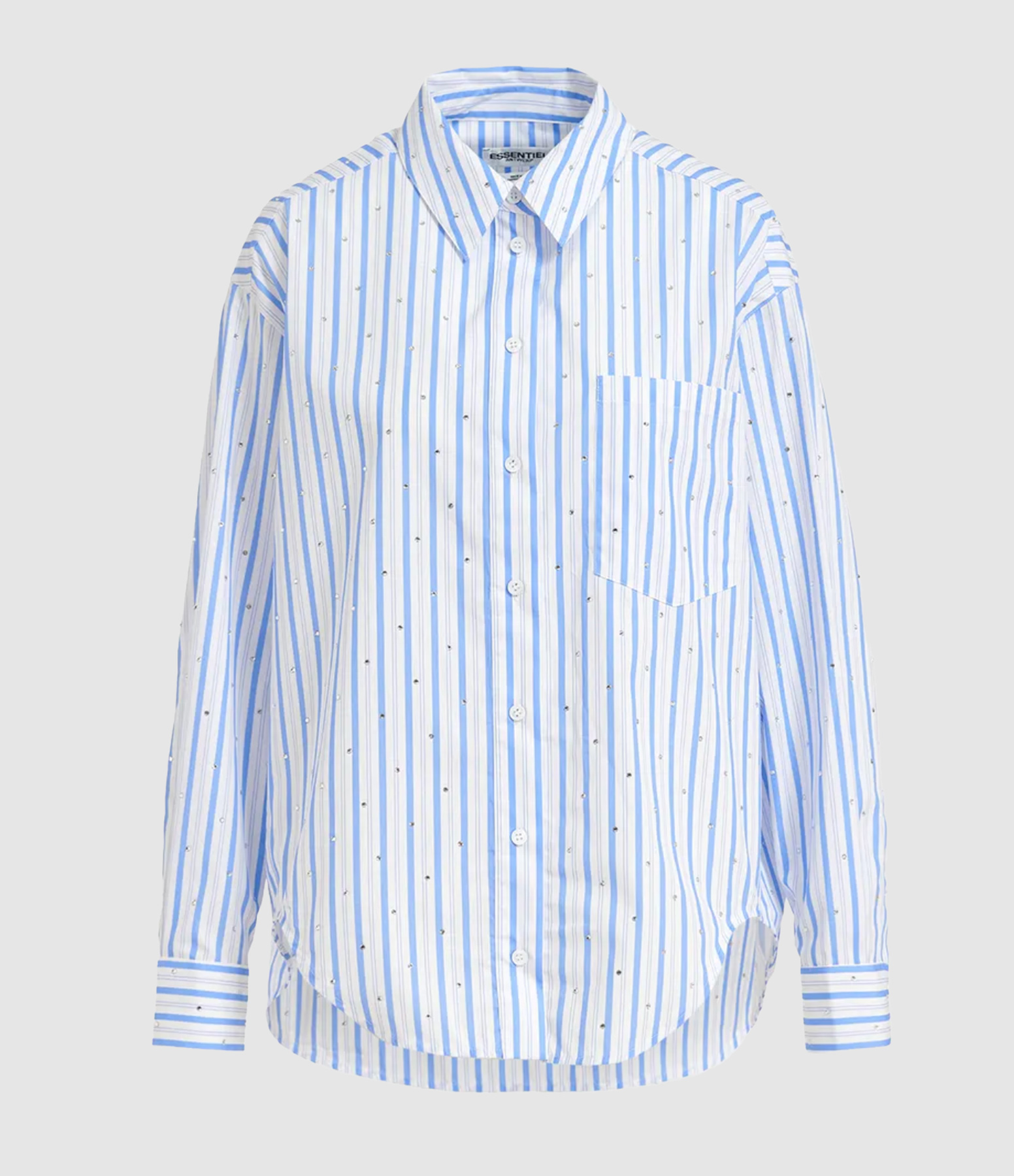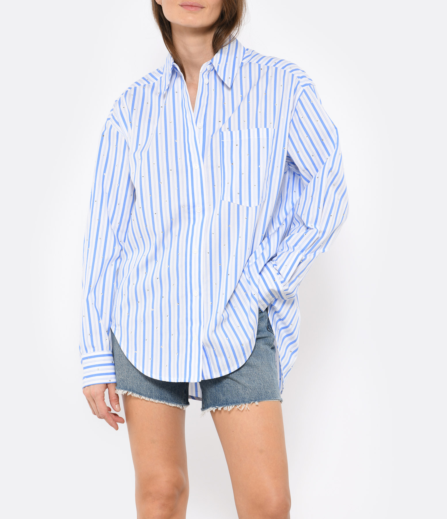 Chemise à rayures bleues et strass. Col chemise. Manches longues boutonnées et resserrées aux poignets. Fermeture par boutons à l'avant. Coupe droite. Base arrondie.