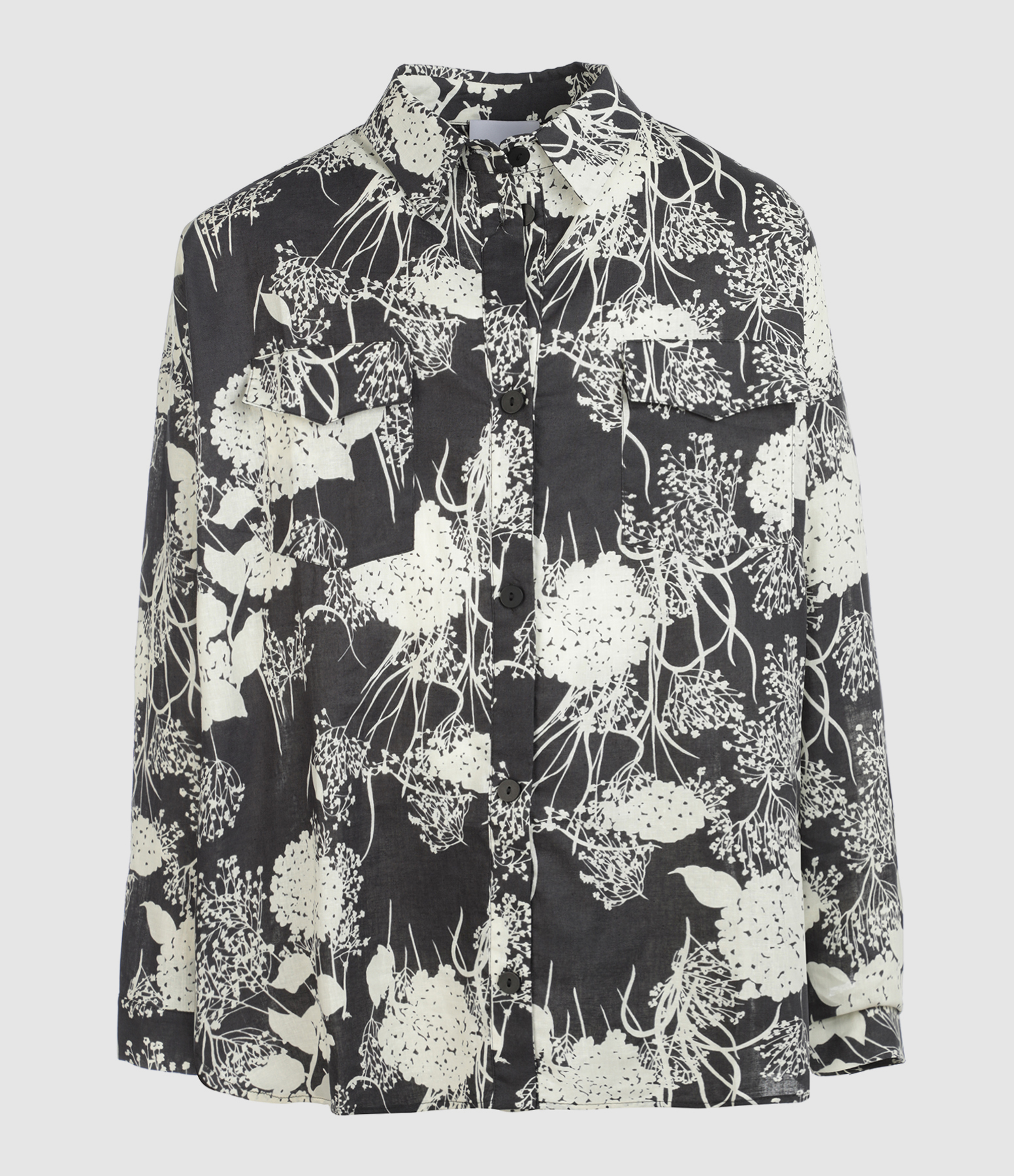 Chemise en coton et lin mélangé à imprimé noir et blanc. Col chemise. Manches longues. Fermeture boutonnée. Coupe ample. Base droite.