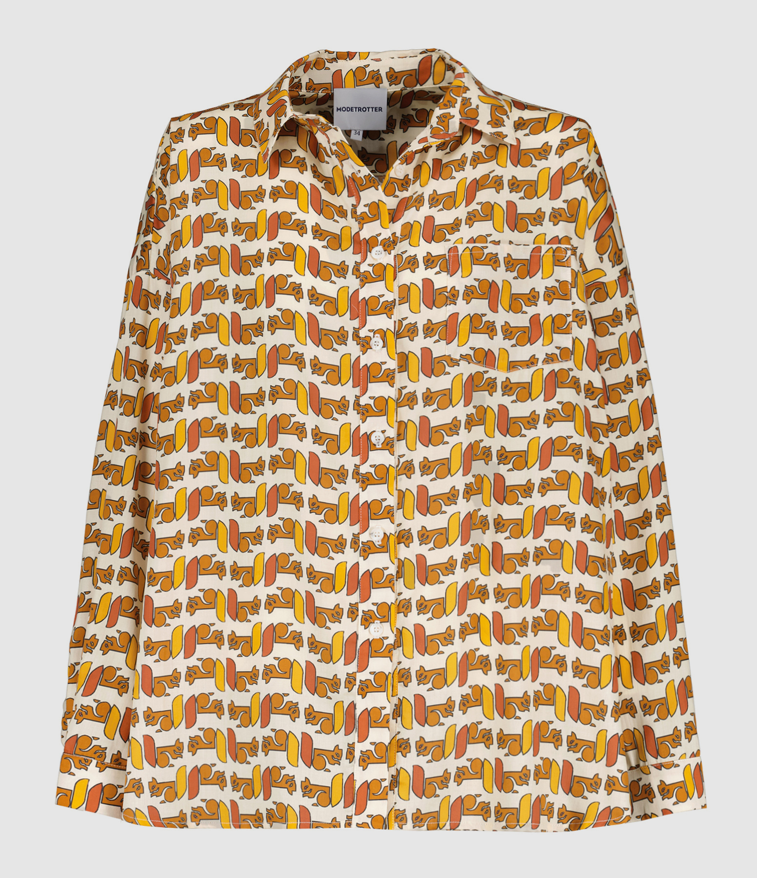 Chemise en coton à imprimé écureuil. Col chemise. Manches longues avec fentes et poignets boutonnés. Fermeture boutonnée sur le devant. Petits boutons blancs nacrés. Une poche plaquée poitrine. Pli creux dans le dos. Fentes latérales. Coupe ample. Longueur plus longue dans le dos que sur le devant. Base arrondie. Non doublée