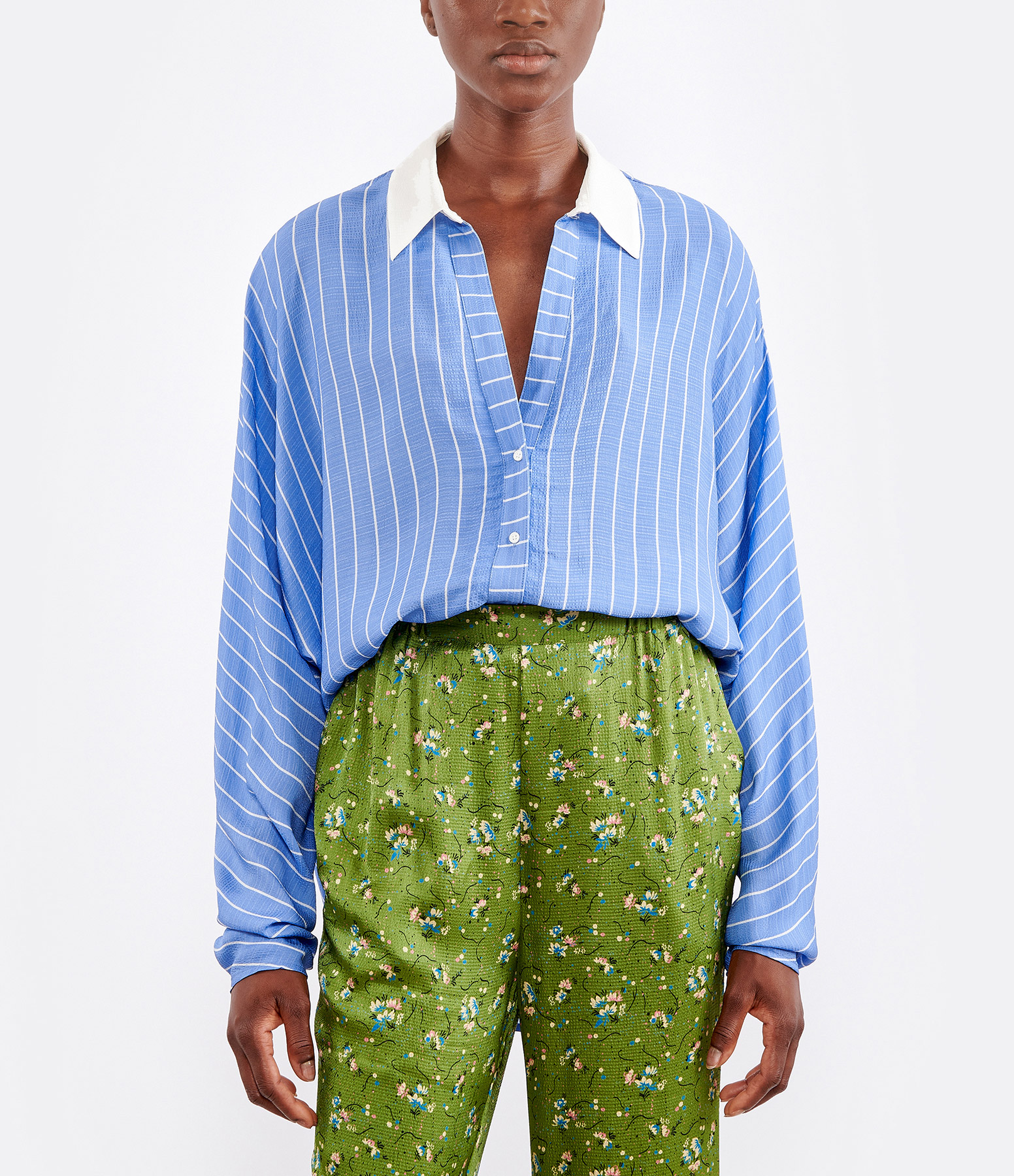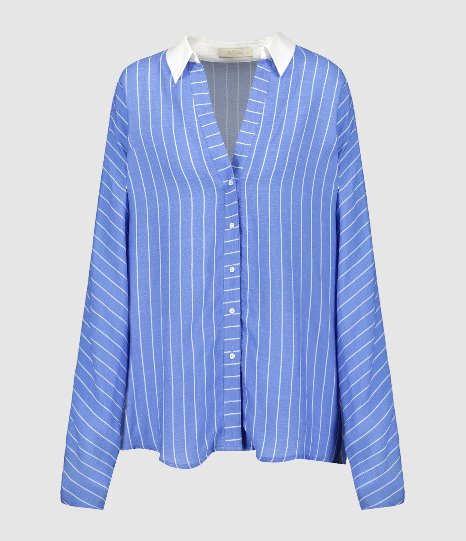 Chemise à rayures blanches et bleues. Manches longues. Décolleté en V. Fermeture par boutons sur le devant. Coupe droite. Base droite.