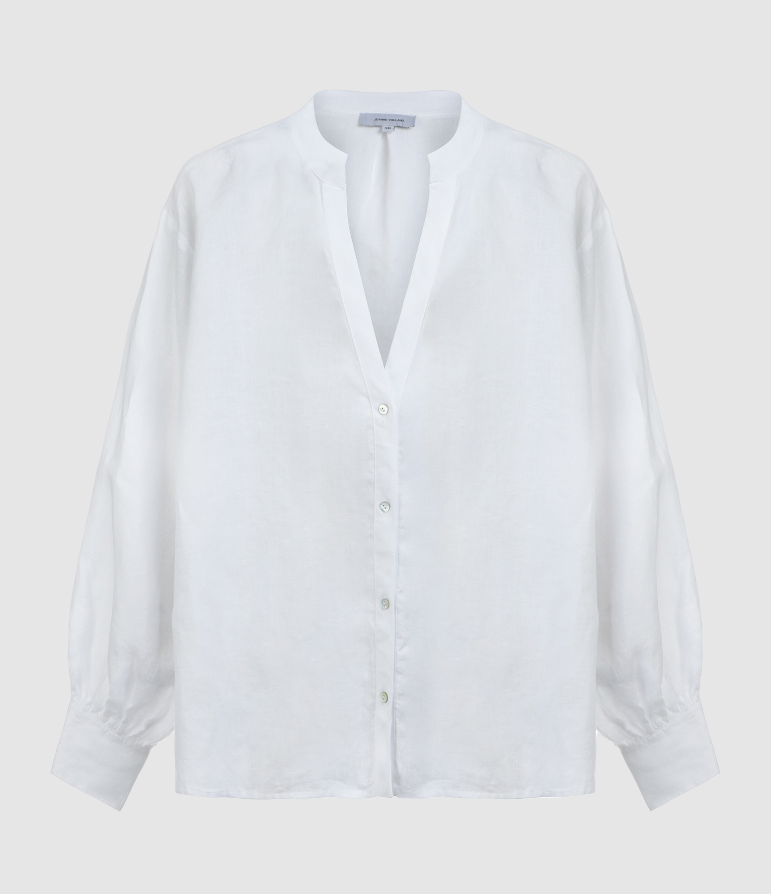 Chemise en lin blanc. Col V. Manches longues resserrées aux poignets. Fermeture boutonnée. Fentes de 19 cm sur les côtés. Coupe ample. Base droite. Non doublée.