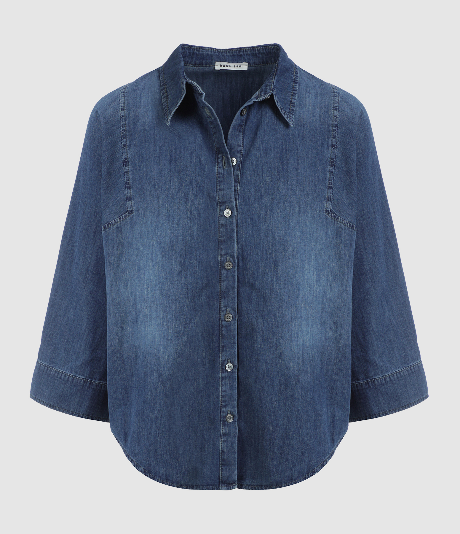 Chemise fluide en denim. Fermetures par boutons gris nacré. Manches longues ample. Coupe droite. Base arrondie légèrement plus longue à l'arrière.