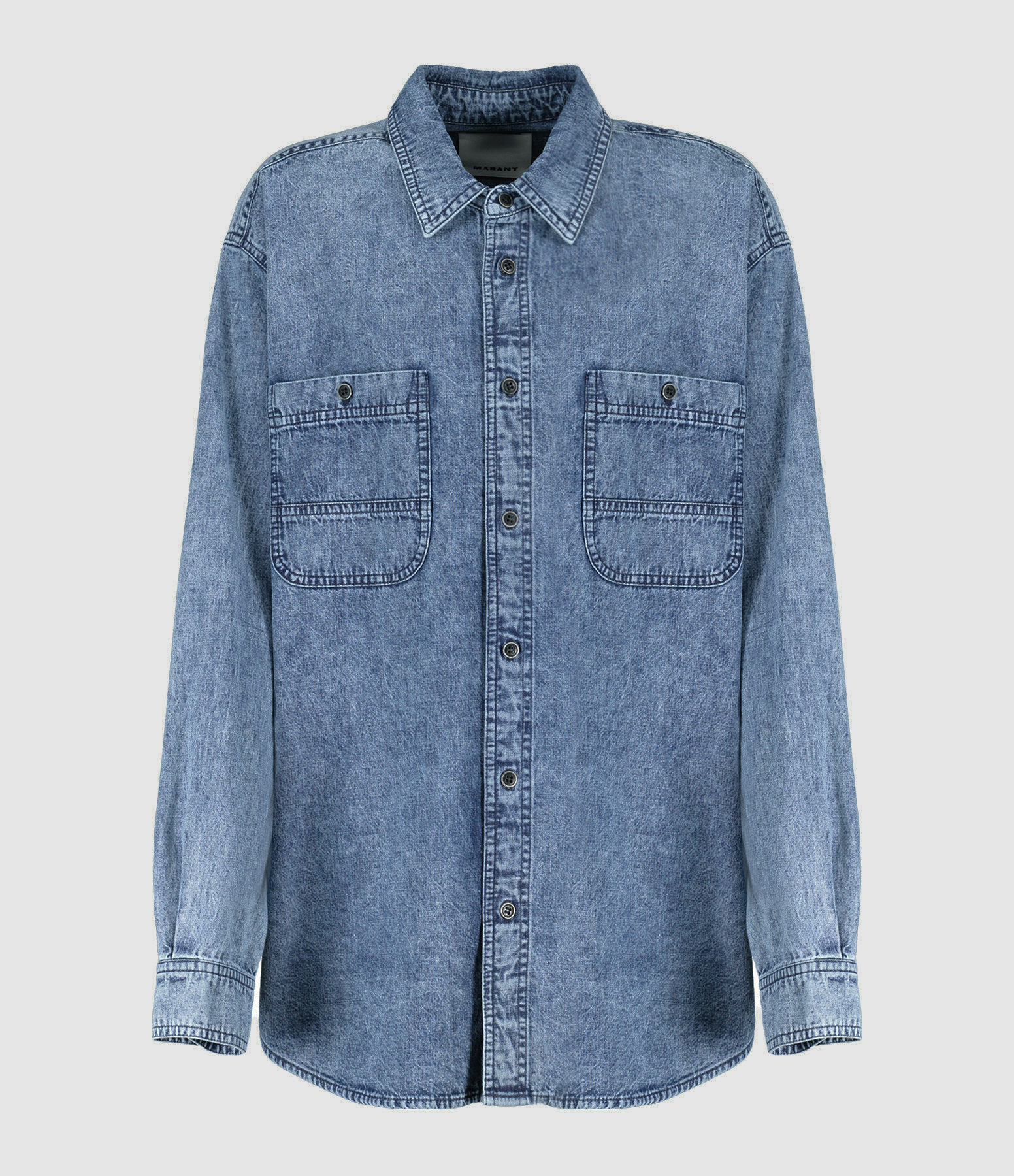 Chemise longue en denim de coton bleu délavé. Col chemisier. Manches longues avec fentes et boutons aux poignets. Fermeture à boutons sur le devant. Deux poches poitrine. Coupe droite. Base arrondie.
