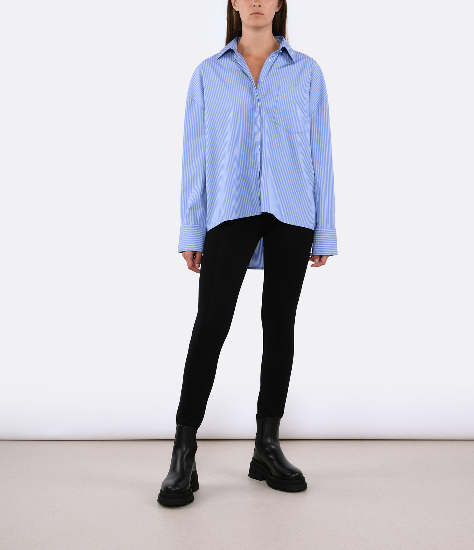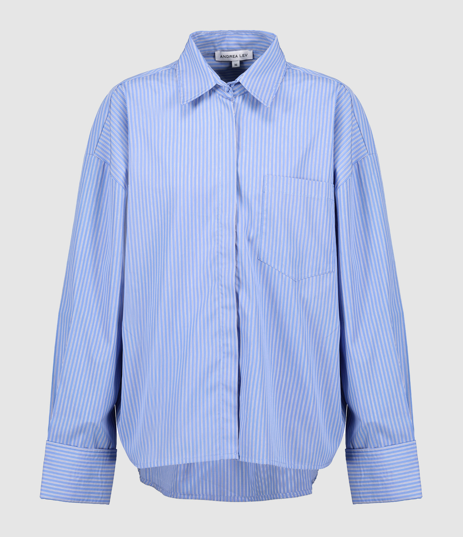Chemise en popeline rayée bleu et blanc. Col chemise. Fermeture boutonnée invisible sur le devant. Poche plaquée sur la poitrine. Manches longues avec poignets retroussés et boutonnés. Coupe droite large. Base arrondie plus longue sur l'arrière.