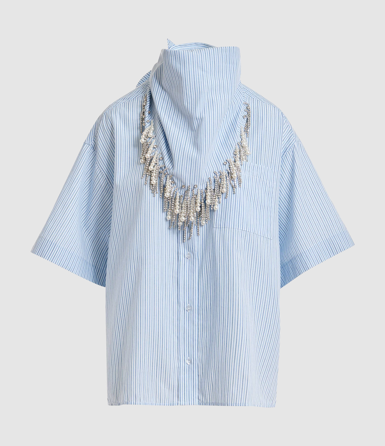 Chemise à rayures bleue avec détail brodé et foulard. Modèle qui se porte oversize. Fermeture par boutonnage. Emmanchure basse. Poche de poitrine. Manches 3/4. Fente dans les coutures latérales. Broderie sur la poitrine.