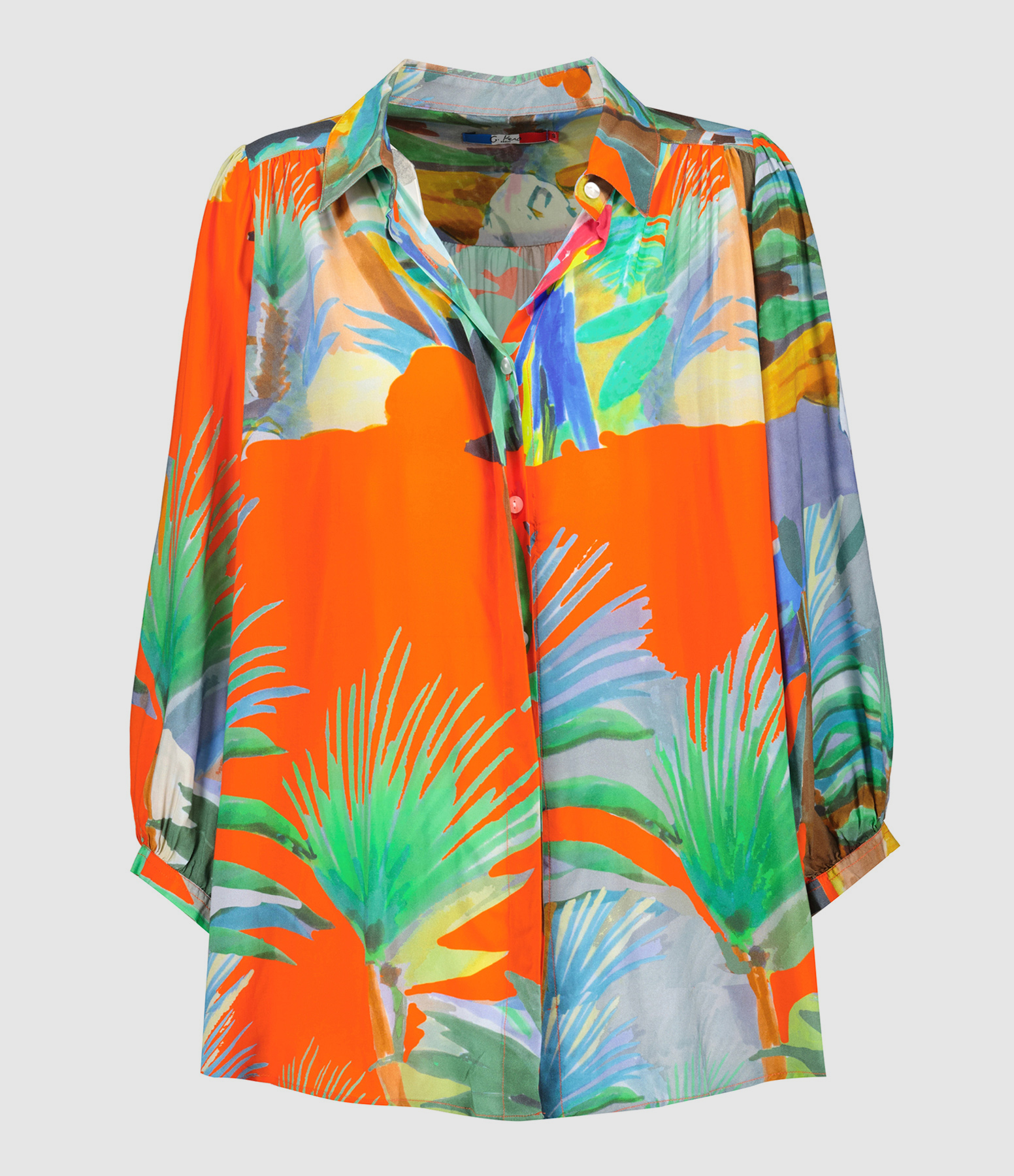 Chemise à imprimé multicolore effet aquarellé. Col chemisier. Manches 3/4 froncées. Fermeture boutonnée. Coupe ample. Base droite.