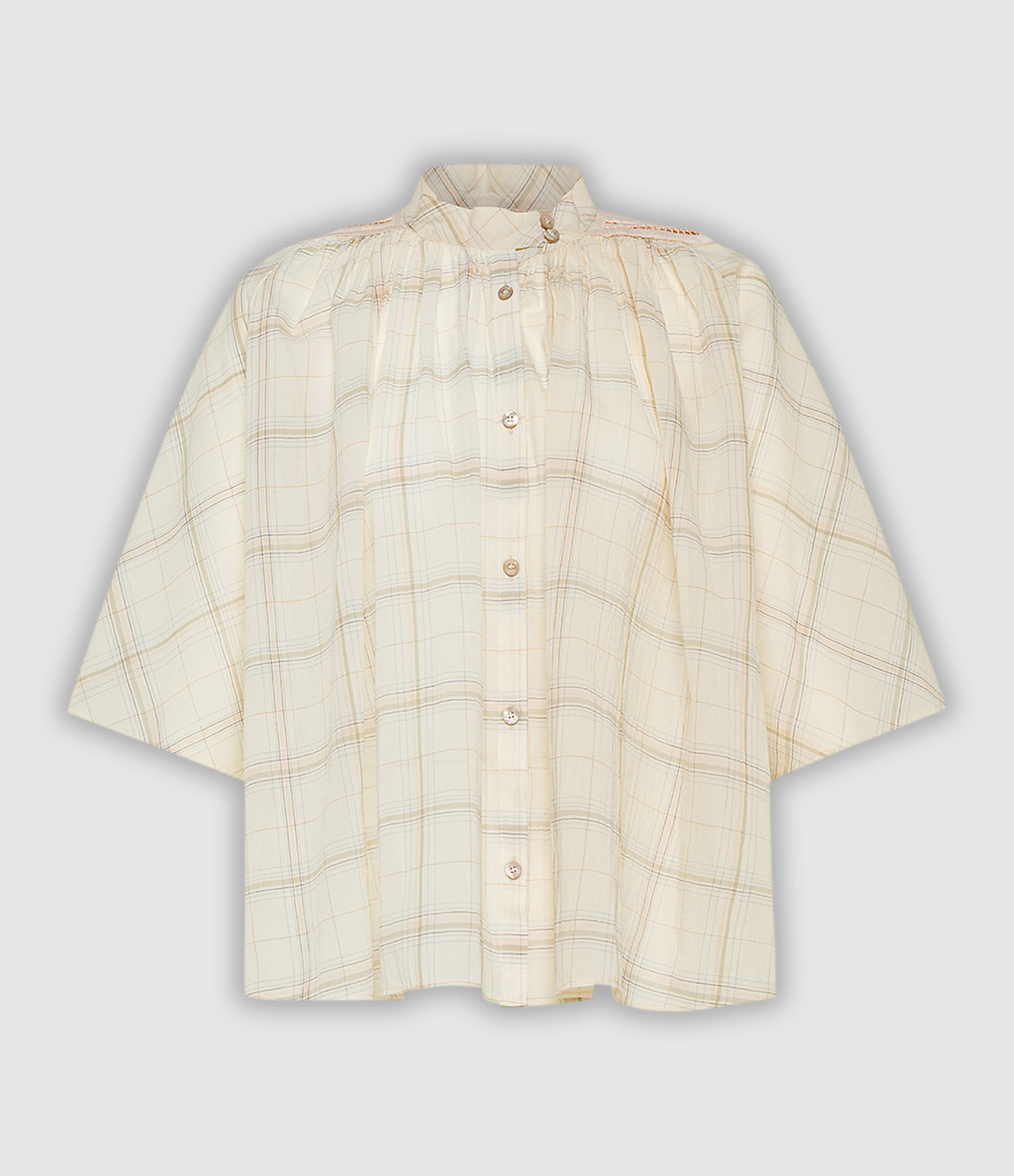 Chemise à imprimé à carreaux. Manches courtes et col rond montant. Épaules plissées. Fermeture par boutons nacrés