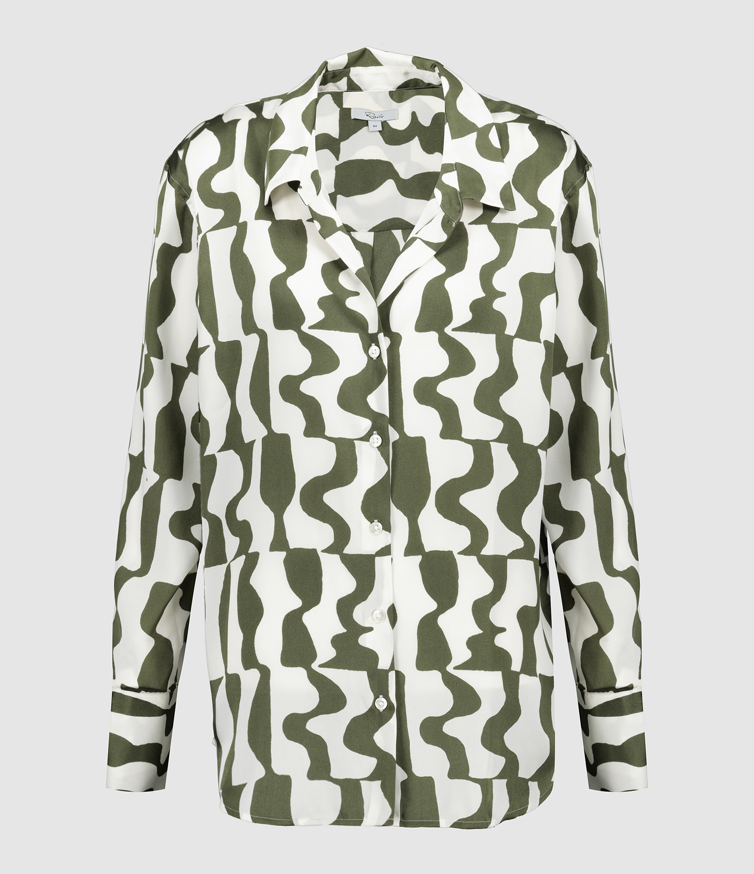 Chemise en soie à imprimés verts et blancs. Manches longues. Fermeture par boutons. Coupe droite. Base arrondie.