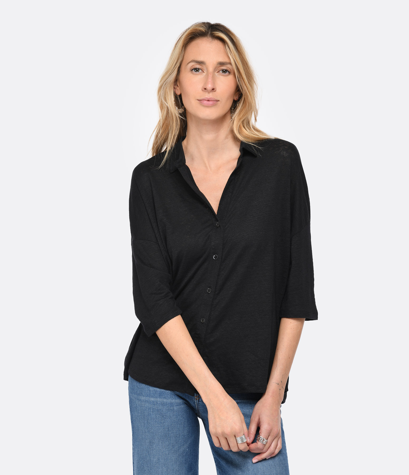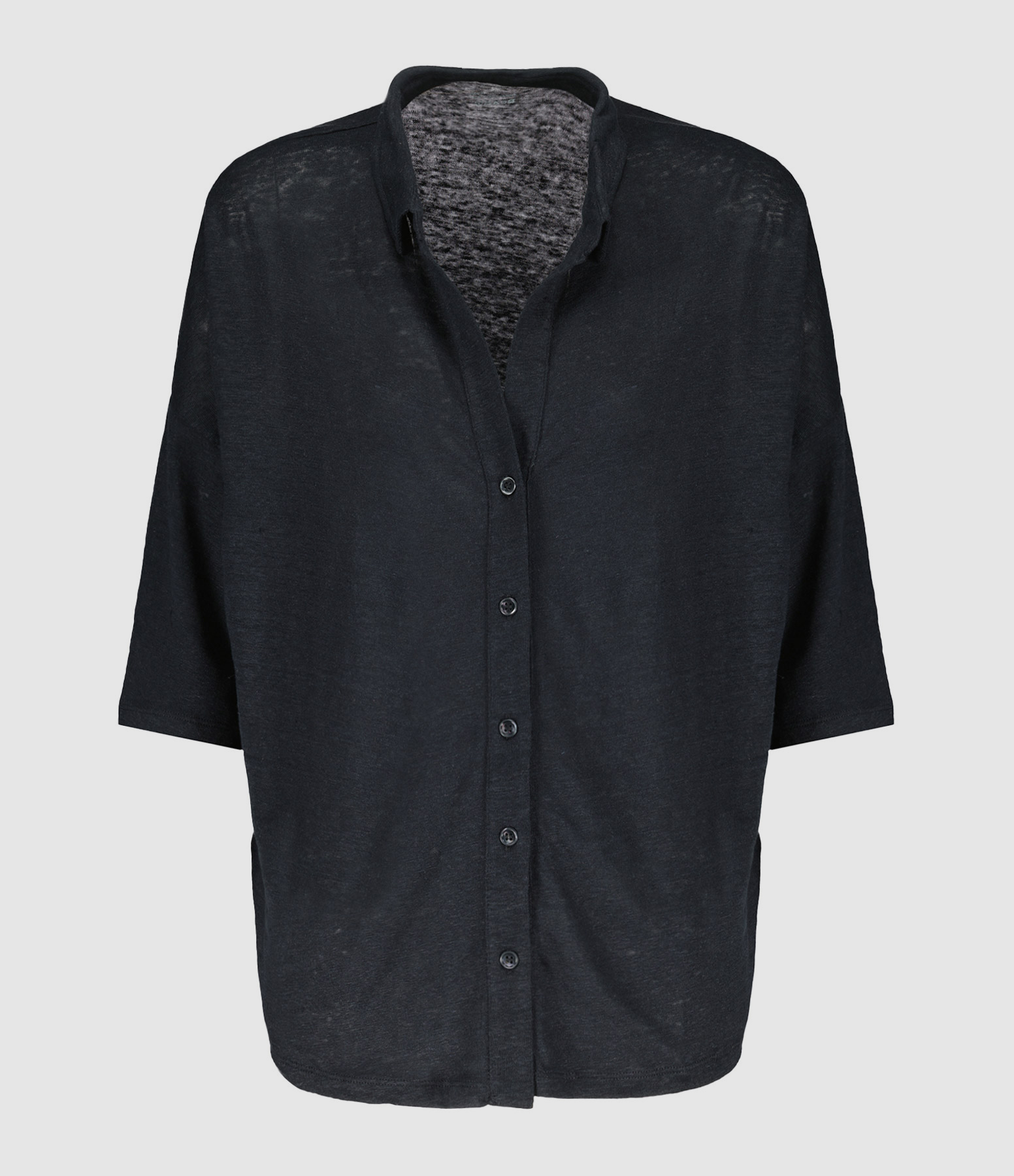 Chemise en lin noir. Col chemisier. Manches courtes. Fermeture par boutons. Coupe large. Base arrondie. Non doublé.