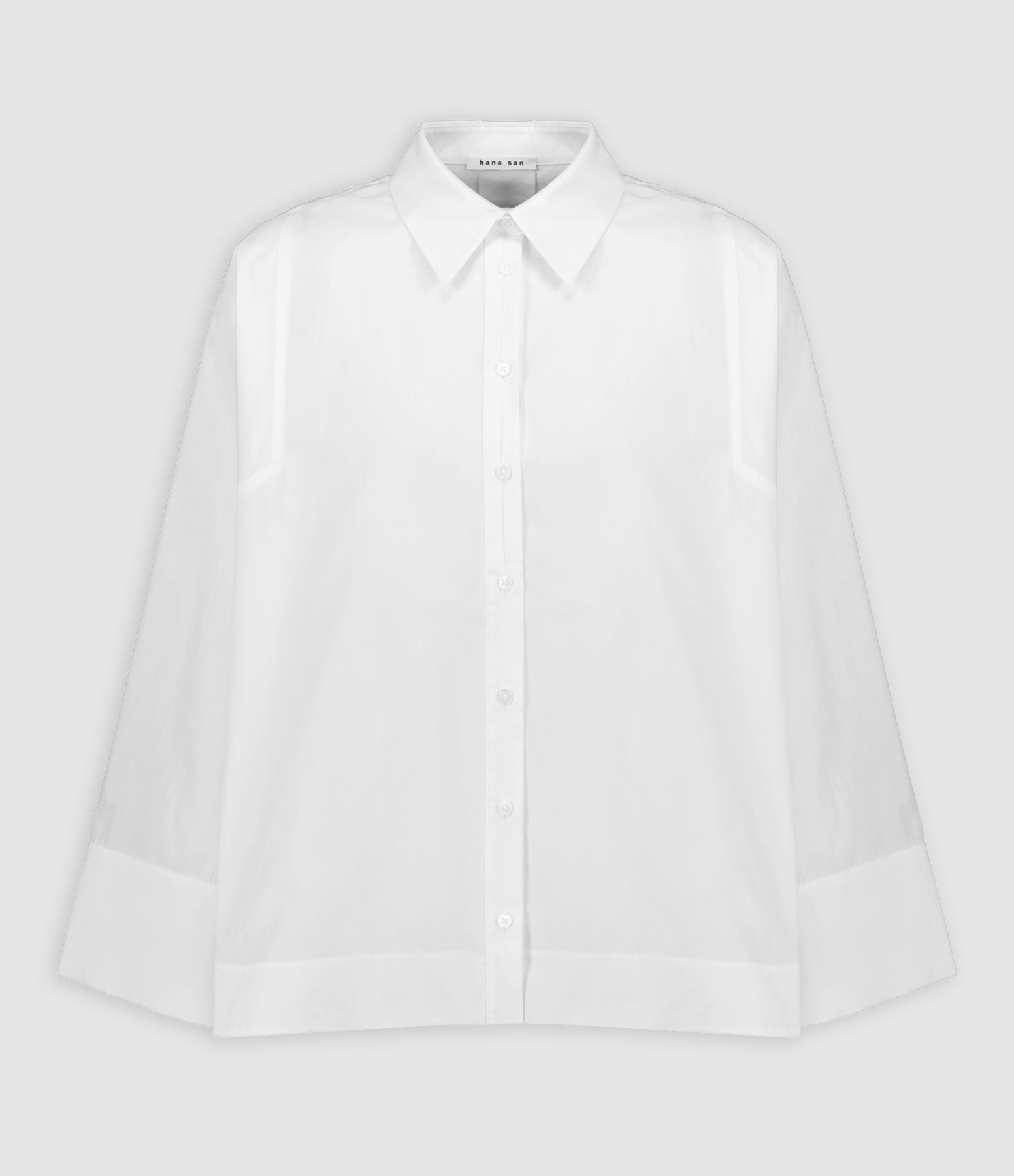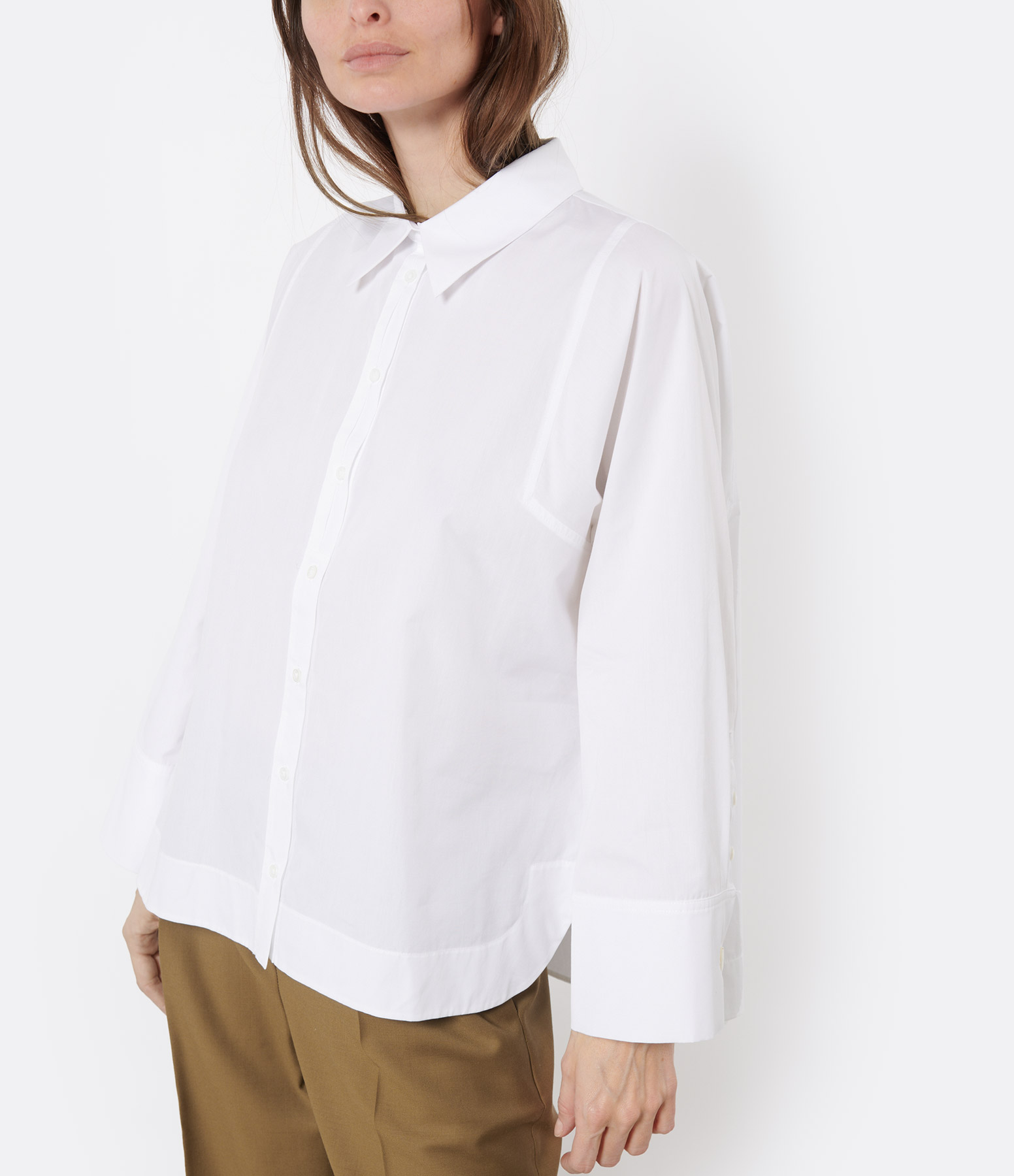 Chemise oversize en coton blanc. Col chemise. Manches longues boutonnées. Coupe droite. Base arrondie.