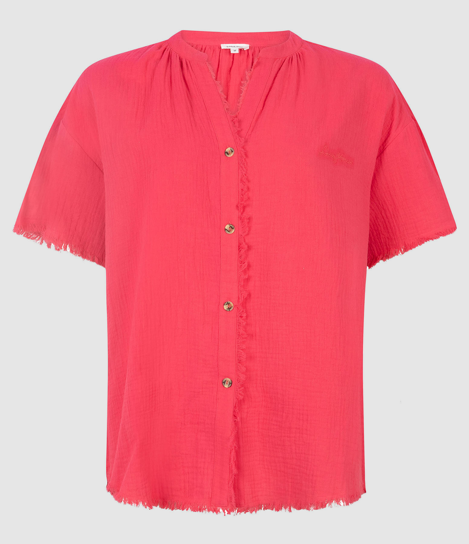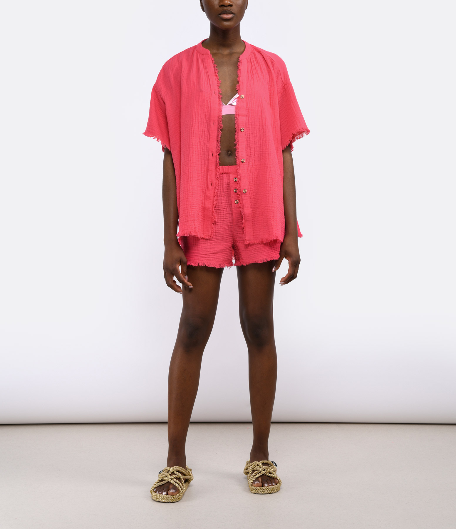 Chemise de pyjama en coton rose. Col chemisier. Manches courtes. Bords frangés. Fermeture par boutons. Coupe droite et large. Base arrondie. Non doublée.