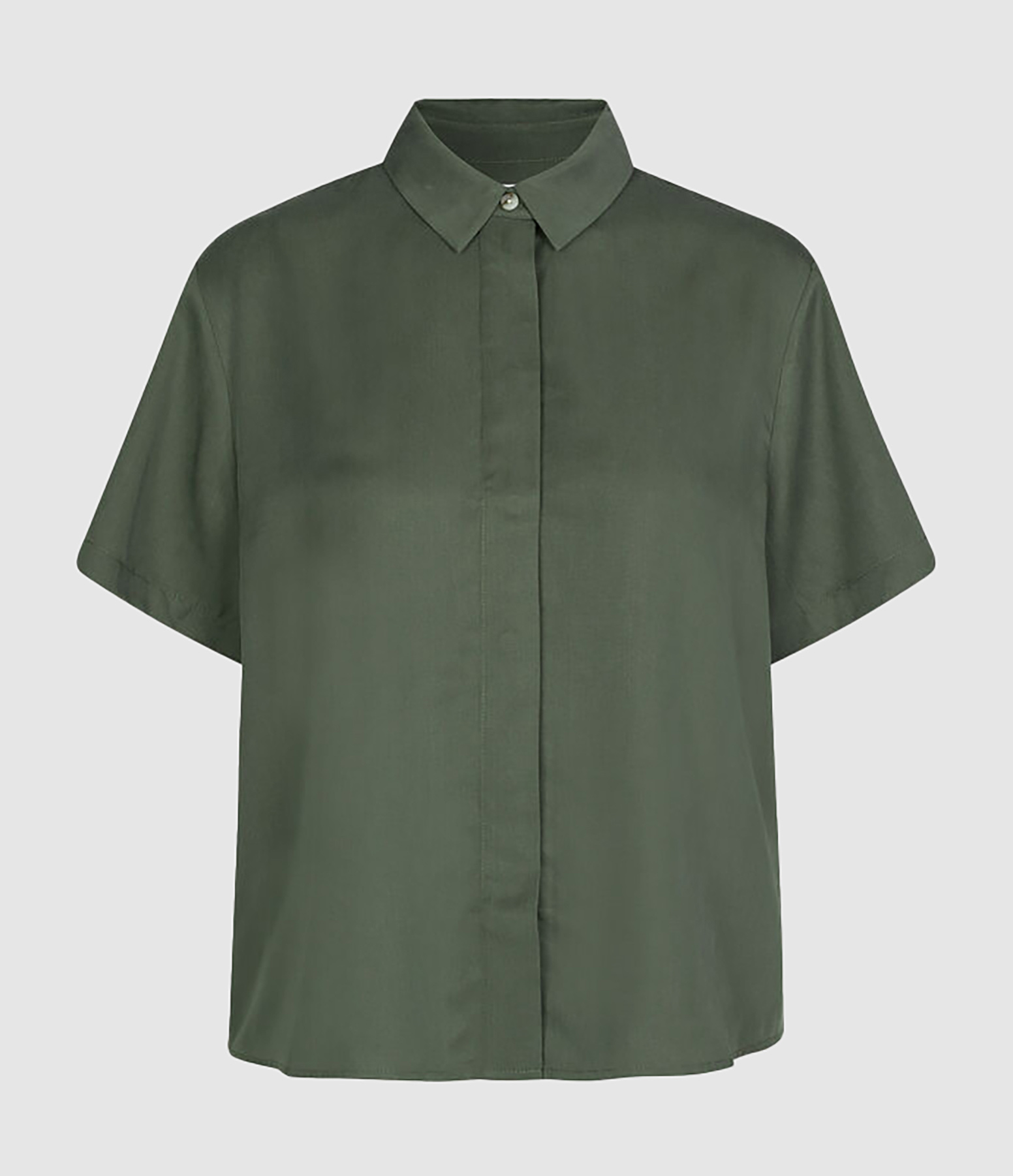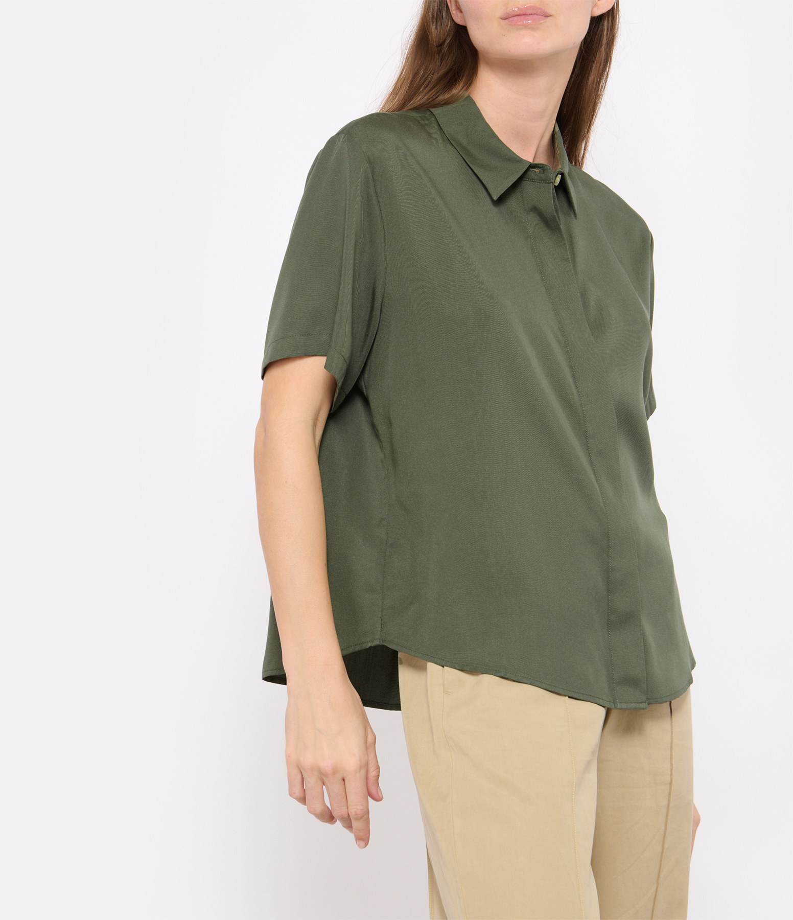 Chemise kaki. Manches courtes. Fermeture par boutons dissimulés. Coupe droite. Base arrondie.