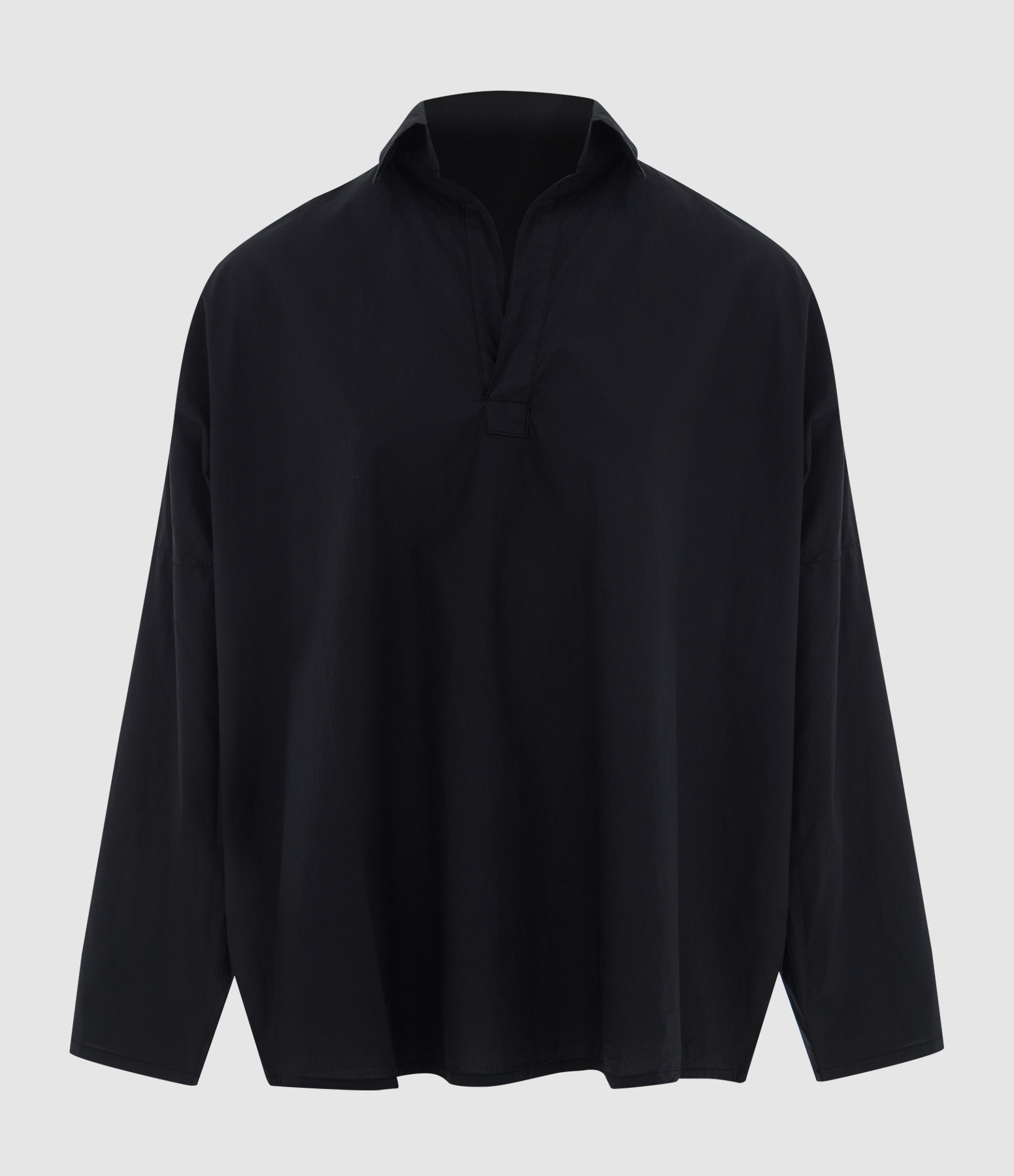 Chemise en coton noir, avec encolure en V. Coupe ample. Base droite.