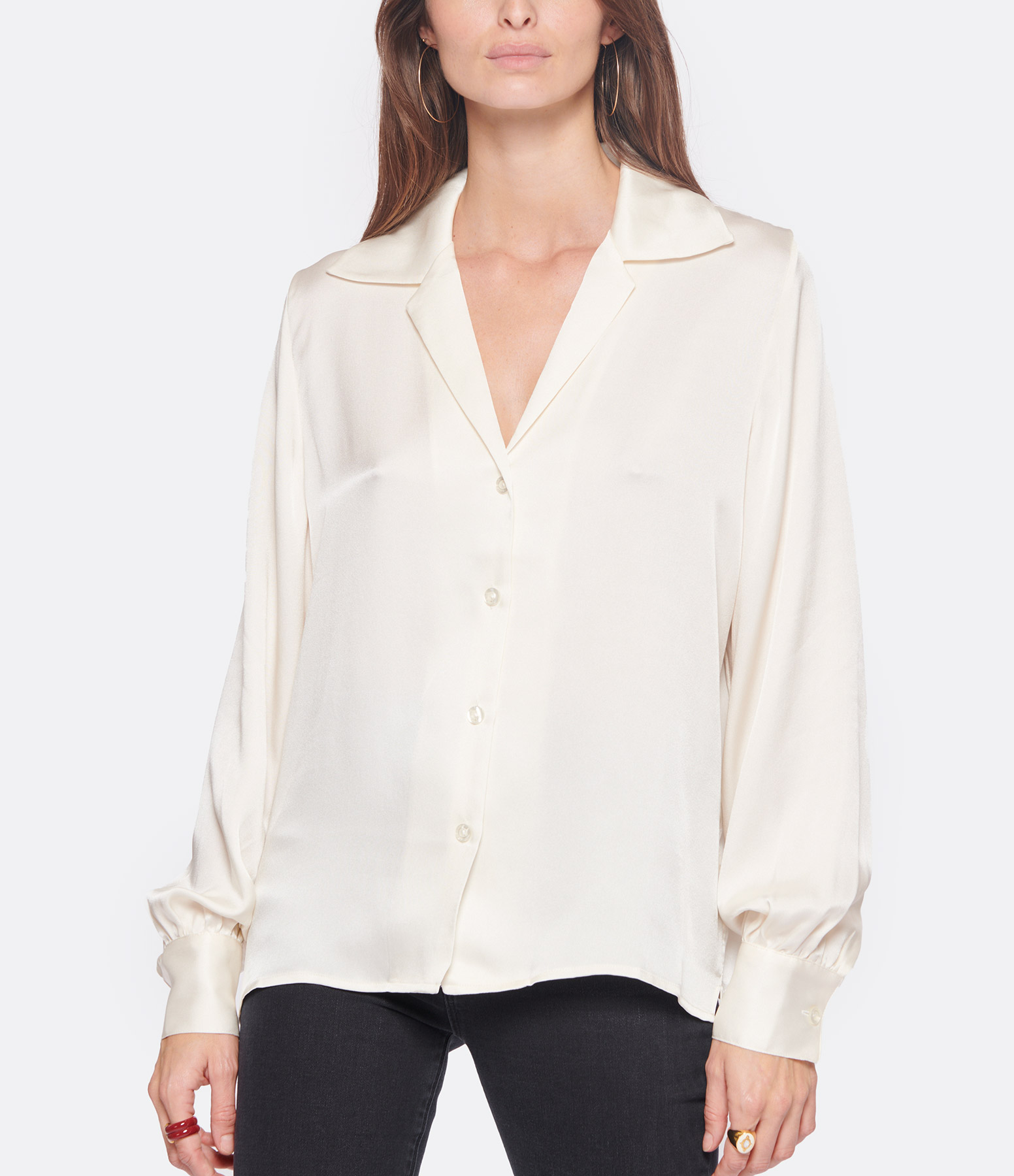 Chemise en soie ivoire. Col pointu. Manches longues avec fentes et poignets boutonnés. Fermeture boutonnée. Coupe droite. Base droite. Non doublée.