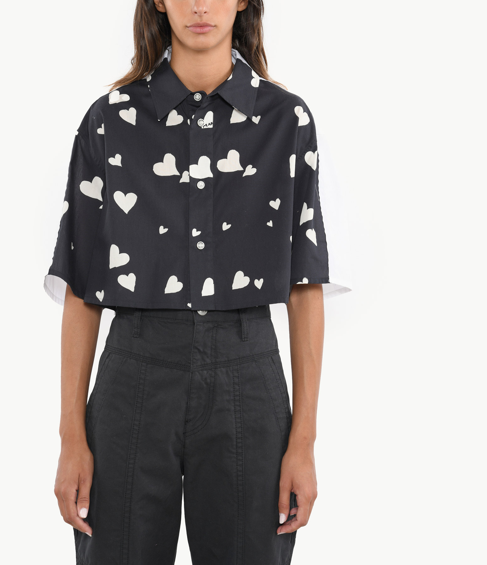 Chemise crop noire avec imprimé cœur blanc. Col chemise avec fermeture par boutons nacrés blancs sur le devant. Inscription MARNI brodée noir dans le dos. Manches courtes. Coupe large. Base droite.