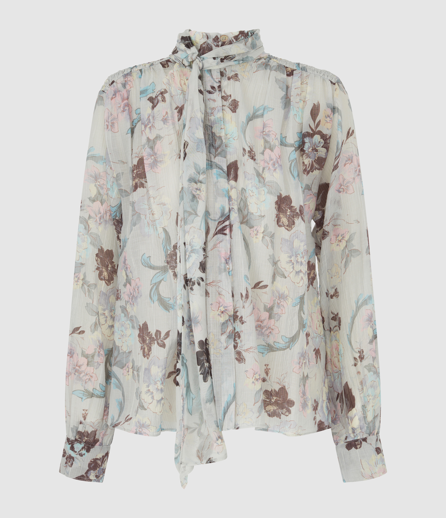 Blouse fluide à manches longues. Imprimé fleuri. Fronces au niveau des épaules. Col à nouer avec deux boutons.