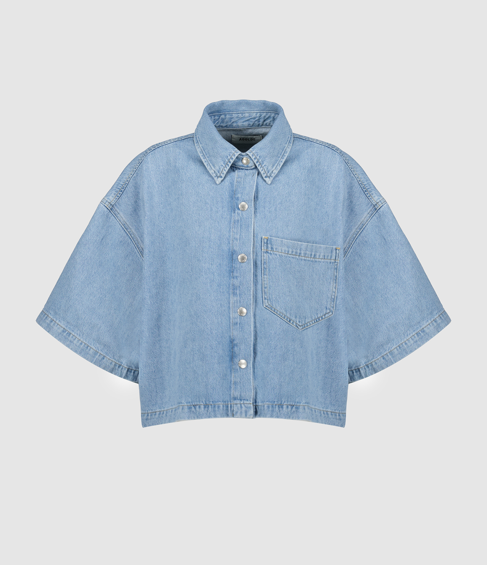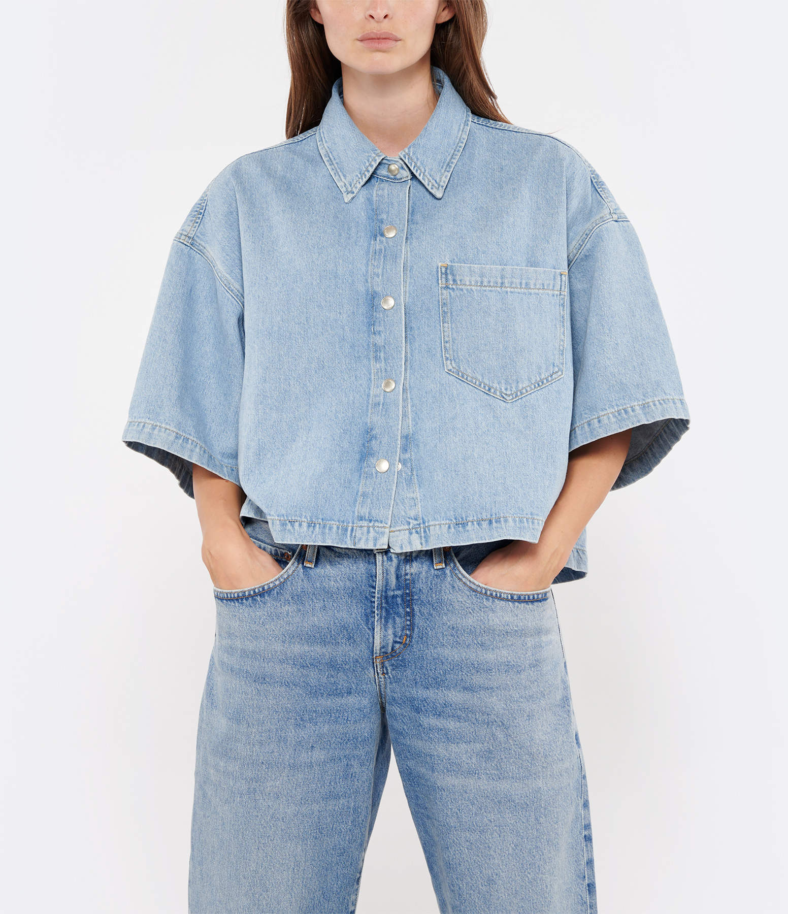 Chemise en denim bleu clair. Manches courtes larges. Col chemise fermé par boutons pression métalliques. Poche plaquée sur la poitrine. Coupe droite courte. Base droite.