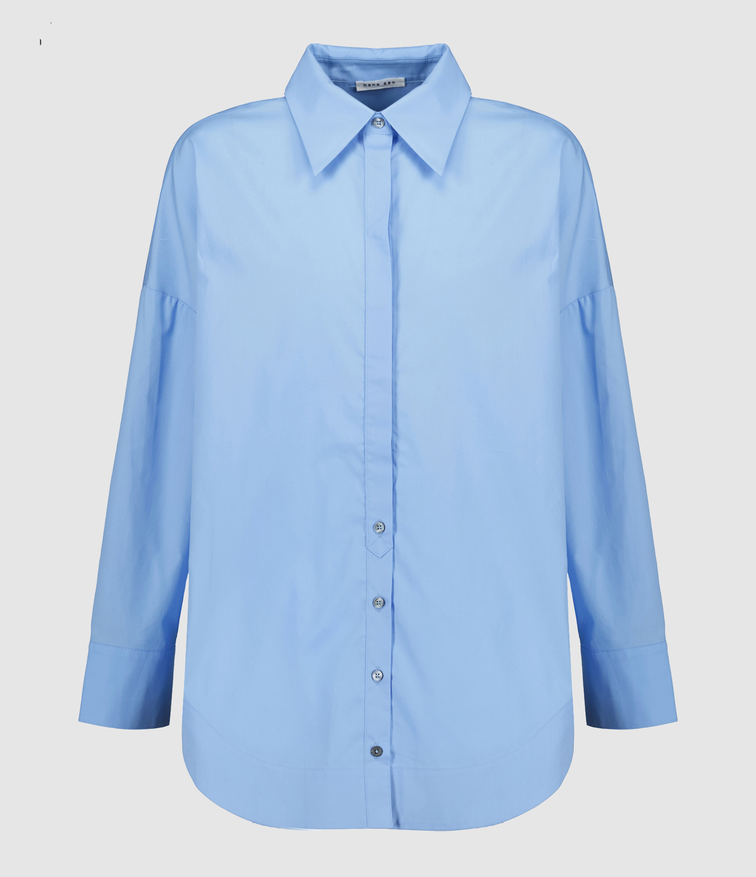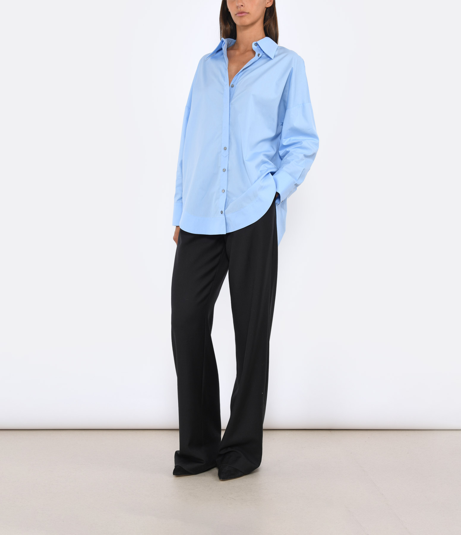 Chemise en popeline de coton bleu. Col chemise avec fermeture boutonnée invisible à l'avant. Boutons nacrés. Manches longues boutonnées aux poignets. Coupe droite. Base arrondie.
