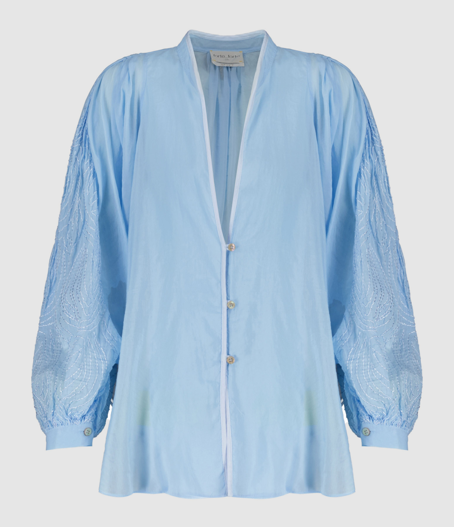 Chemise en coton et soie bleu. Col en V. Épaules froncées. Manches longues ornées de broderies avec fentes et poignets froncés et boutonnés. Fermeture boutonnée sur le devant. Petits boutons nacrés. Coupe large. Base arrondie.