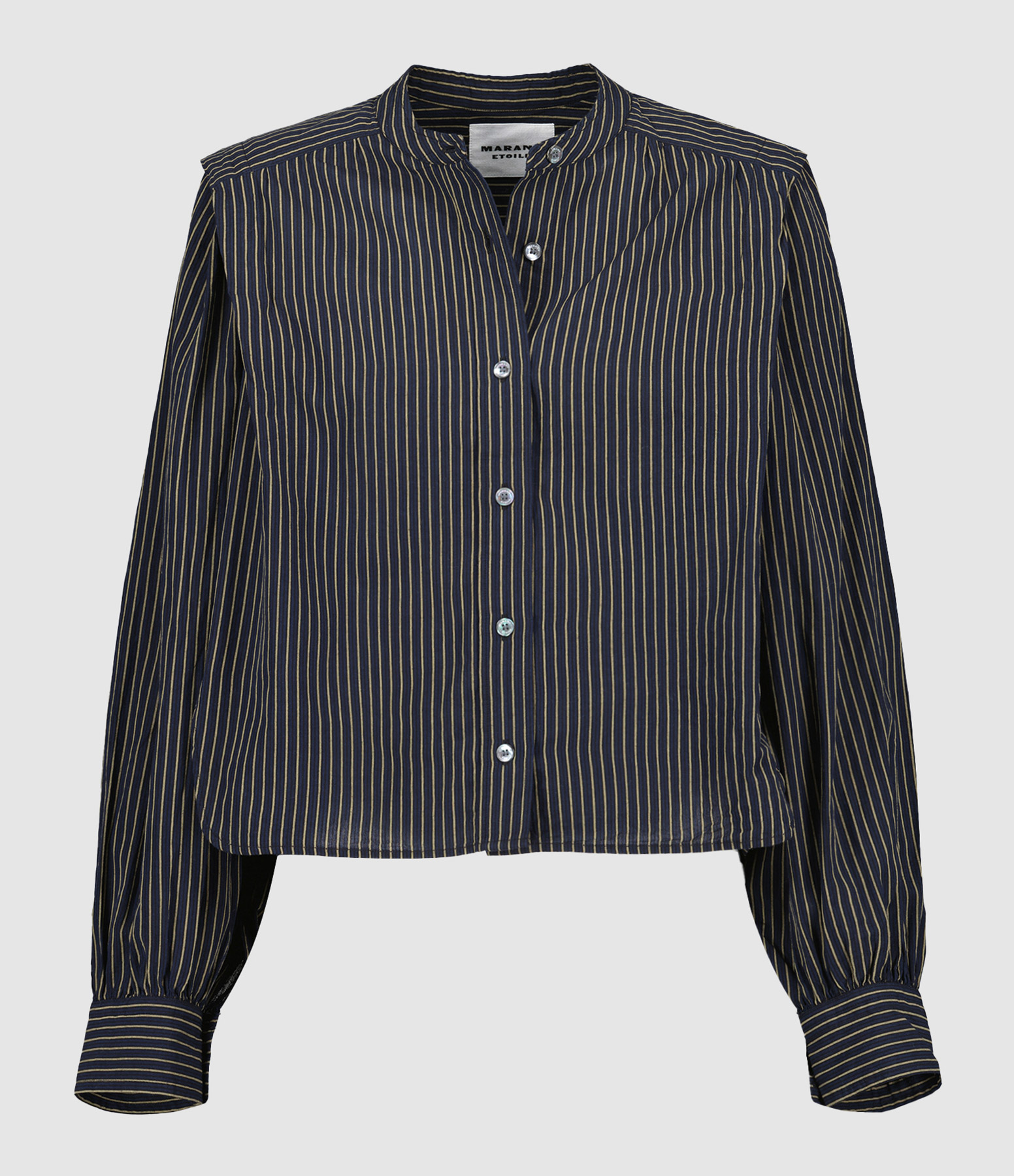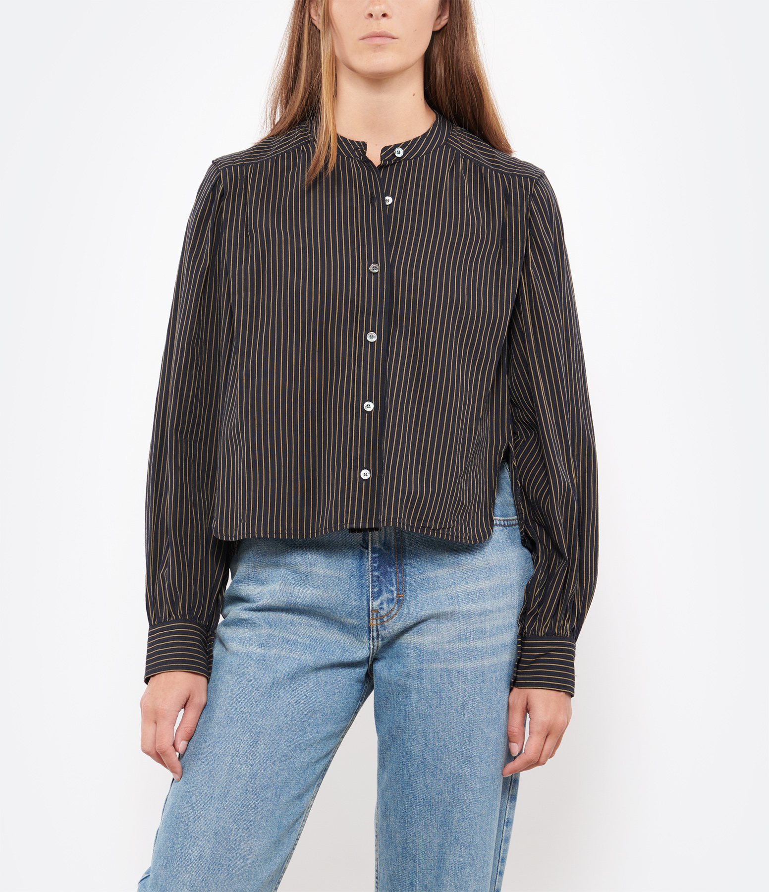 Chemise à rayures bleu nuit et beige. Col mao. Fermeture par boutons sur le devant. Formes d'épaulettes sur le haut des manches. Fronces dans le dos. Boutons nacrés gravés de la marque. Manches longues ballon resserrées aux poignets et boutonnées. Fentes latérales. Coupe droite. Base arrondie.