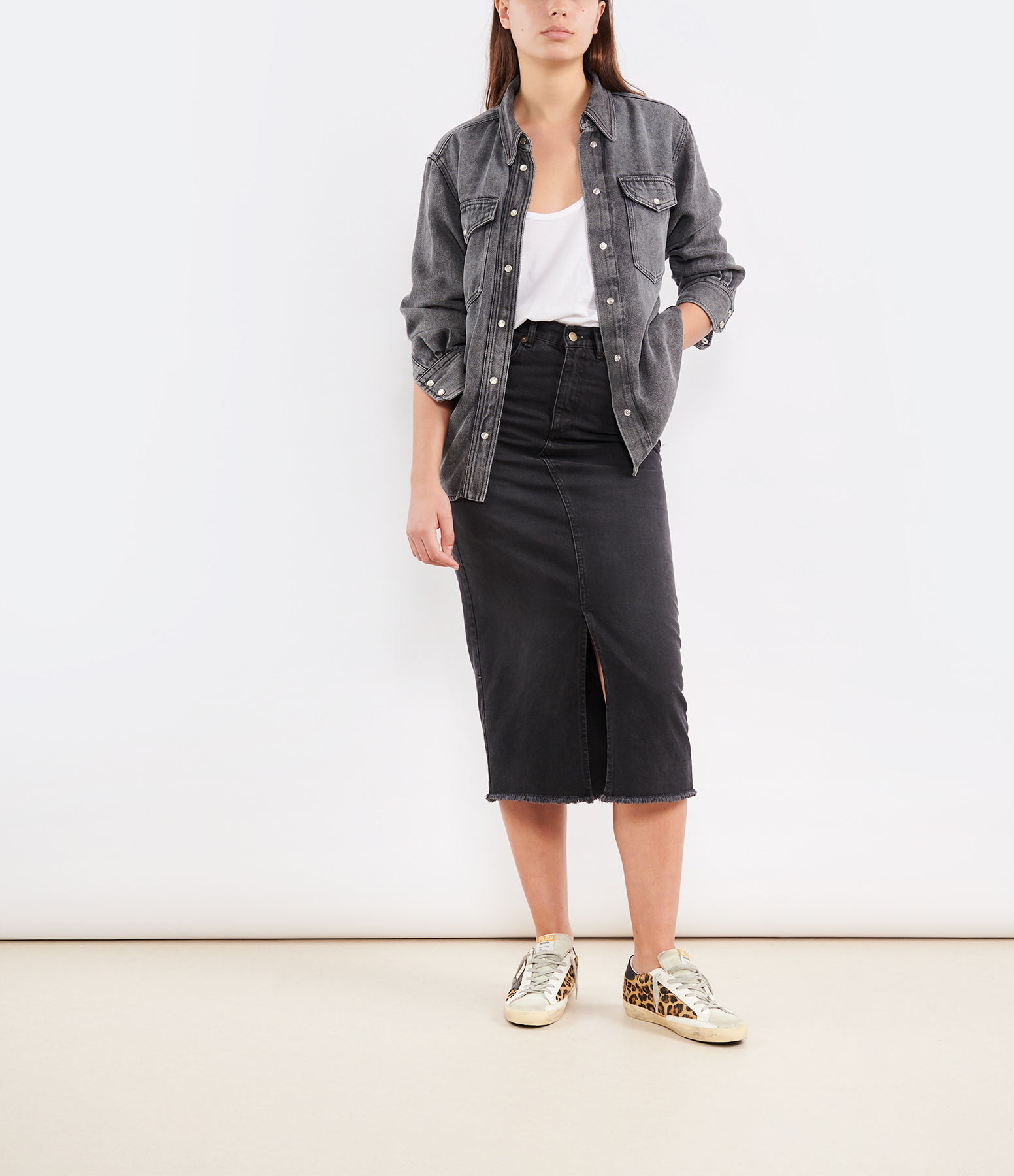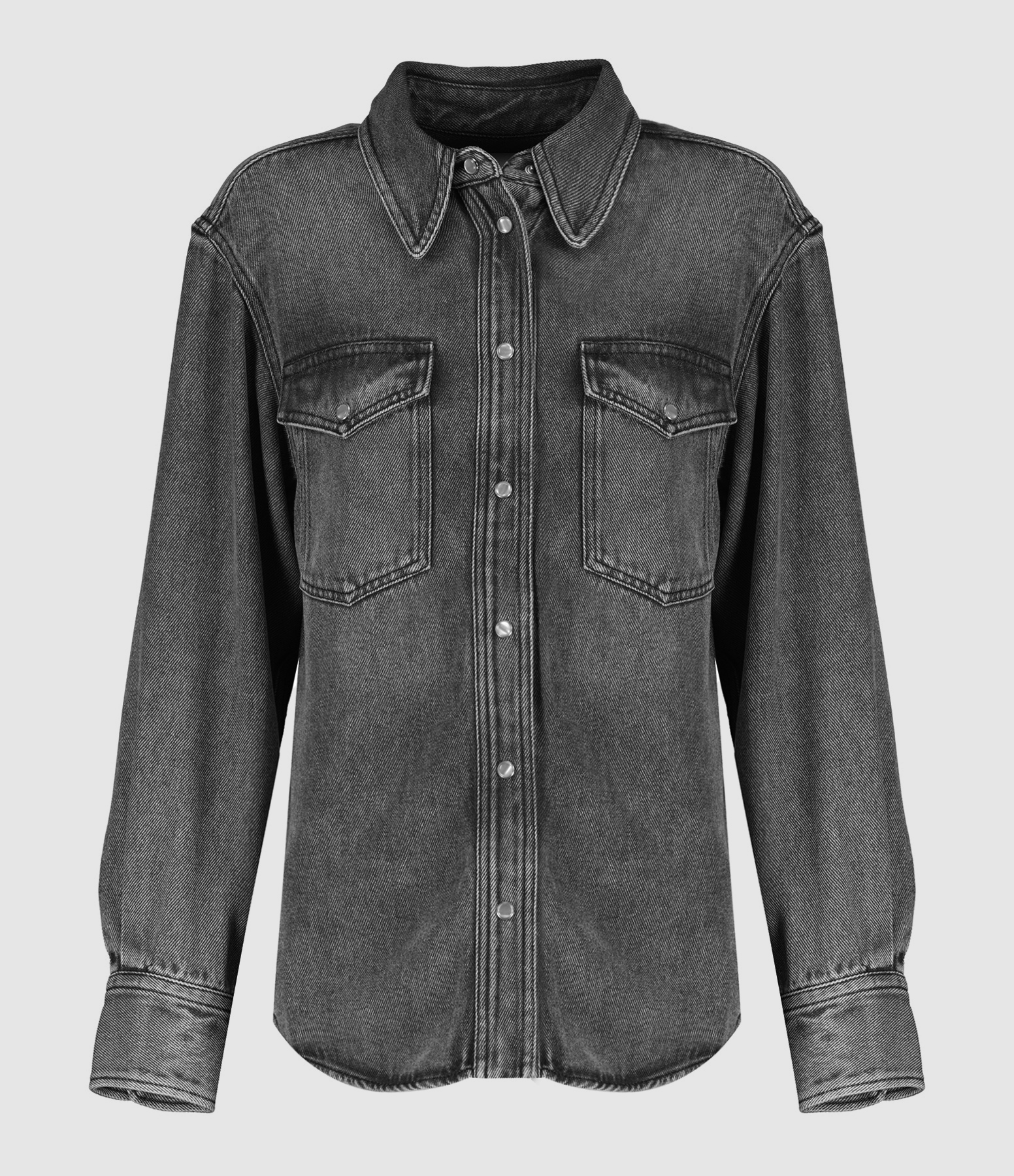 Chemise en denim gris. Col chemisier. Manches longues avec fentes et poignets pressionnés. Fermeture pressionnée sur le devant. Deux poches à rabat pressionnée sur le devant. Petits boutons nacrés. Fentes latérales. Coupe droite. Base arrondie.