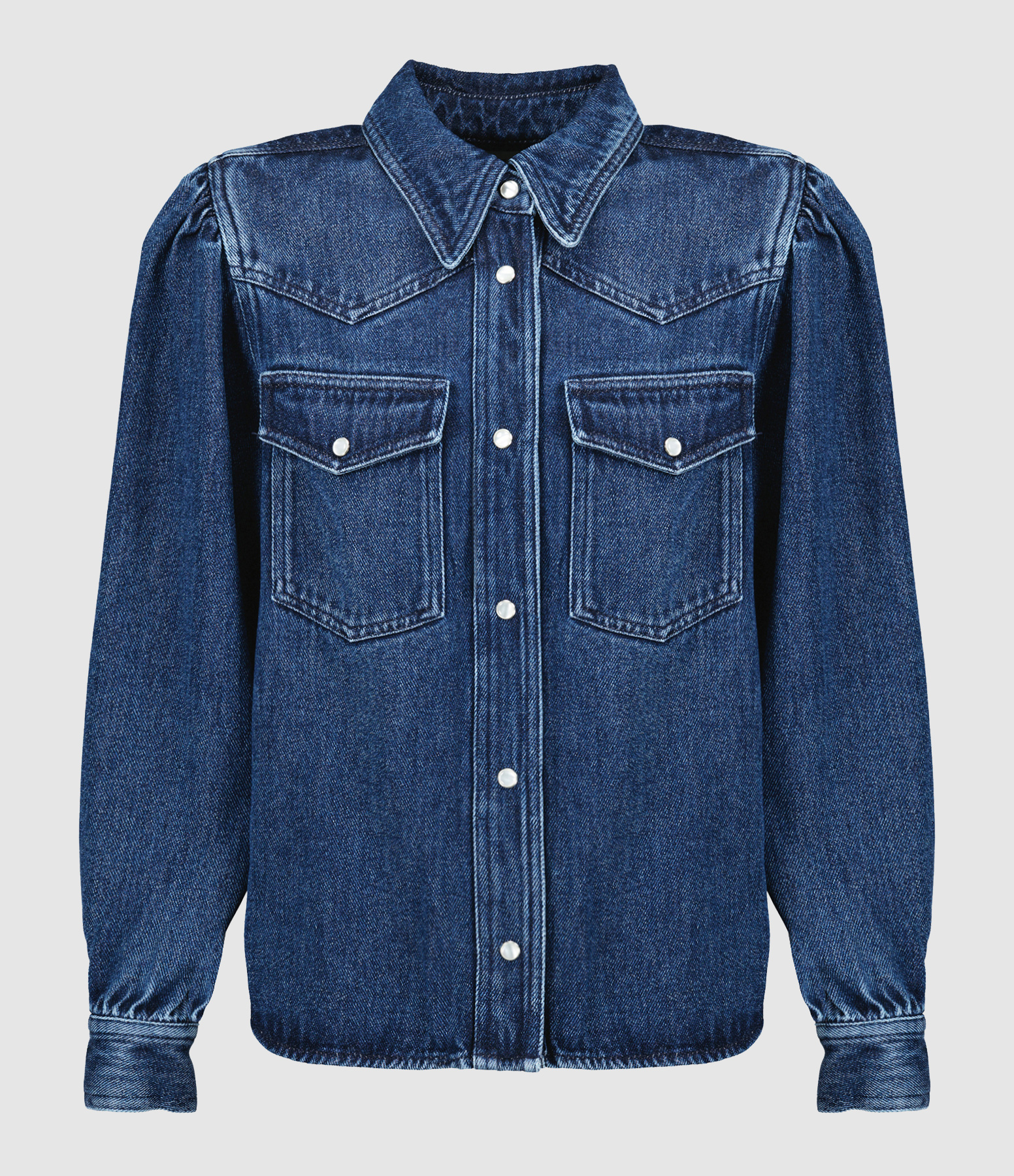 Chemise en denim de lyocell et coton bleu. Col chemisier italien. Manches longues bouffantes avec fentes et poignets pressionnés. Fermeture pressionnée simple sur le devant. Boutons métalliques nacrées. Deux poches poitrine à rabat pressionnées sur le devant. Coupe droite. Base liquette.