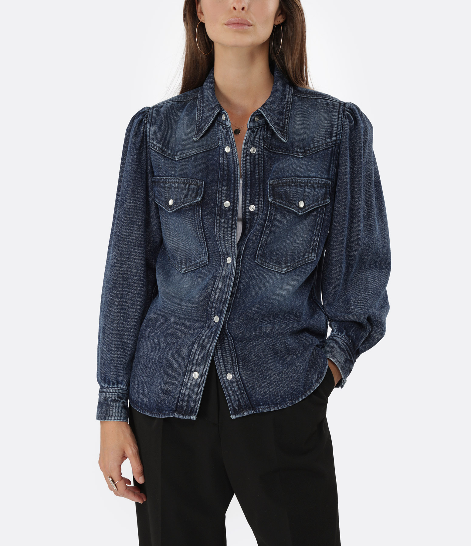 Chemise en denim de lyocell et coton bleu foncé. Col chemisier italien. Manches longues bouffantes avec fentes et poignets pressionnés. Fermeture pressionnée simple sur le devant. Boutons métalliques nacrées. Deux poches poitrine à rabat pressionnées sur le devant. Coupe droite. Base liquette.